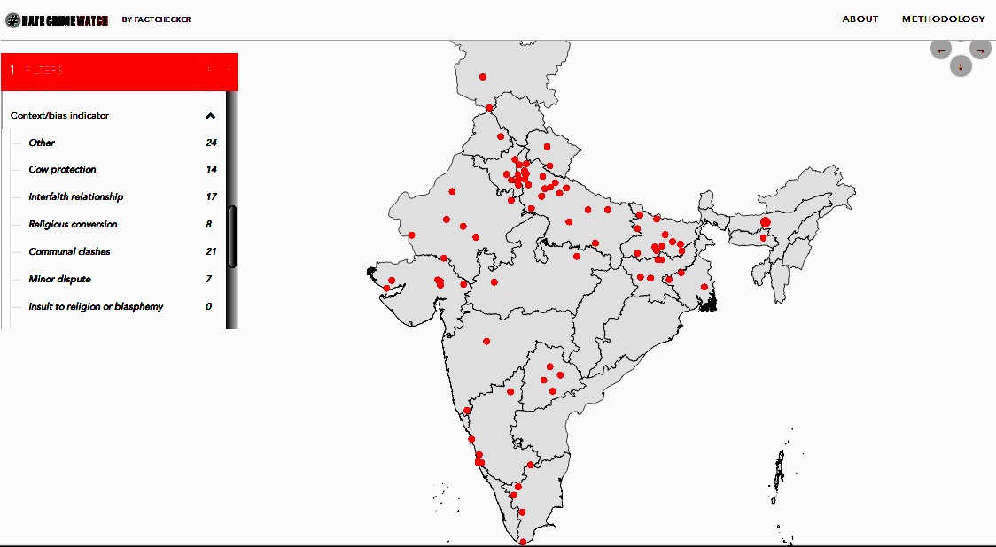 Factchecker website HateCrimeWatch records 92 incidents of hate crimes in the country in 2018. Out of these 14 have been linked to cow protection, 17 to interfaith relationships, 8 to religious conversions, and 21 to communal clashes. In its report titled “Cow Vigilantism: Crime, Community and Livelihood- January 2016 to March 2018”, the rights organisation PUDR documented 137 incidents of cow vigilantism. In 75% of the incidents the victims were Muslims and in another 12% Dalits were targeted (out of 106 cases where the identities could be confirmed). “The highest number of attacks against Muslims, have taken place in the strongholds of the BJP – UP, Rajasthan, Haryana, Gujarat, MP. UP, where the largest number of incidents have occurred, seems to be an anomaly as 24 of the 32 incidents in the state occurred before the BJP formed the government. UP illustrates that the roots of cow-politics date far back with the RSS having been active in the state since 1966, and reproducing itself through organisations such as the Hindu YuvaVahini founded in 2002 by Yogi Adityanath, who is now CM. Of the 13 attacks against Dalits, eight have been in Gujarat, the BJP’s laboratory for Hindutva,” says the report.