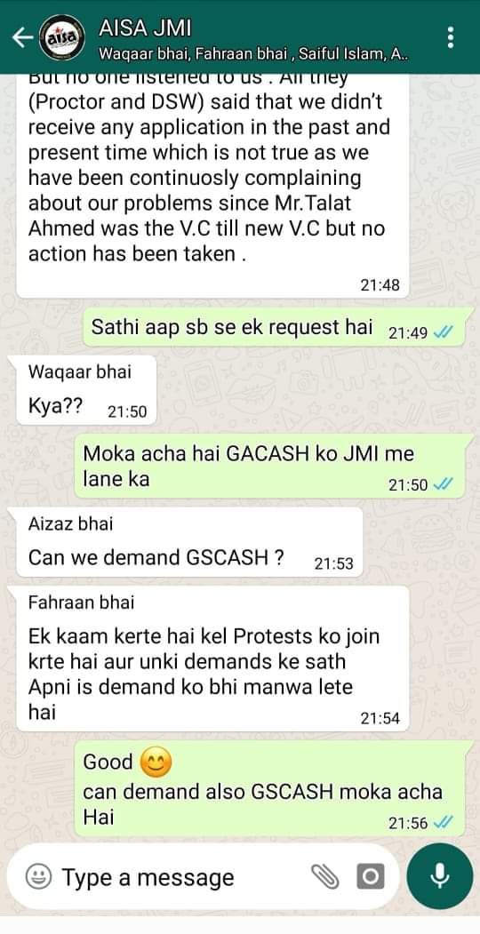 An allegedly forged image that is being circulated, with the aim of suggesting that members of the left affiliated All India Students Association (AISA) are surreptitiously inserting unrelated agenda into the protests. The supposed instance of such an agenda is the demand for the formation of a democratically elected body (GSCASH) to process grievances and harassment allegations!