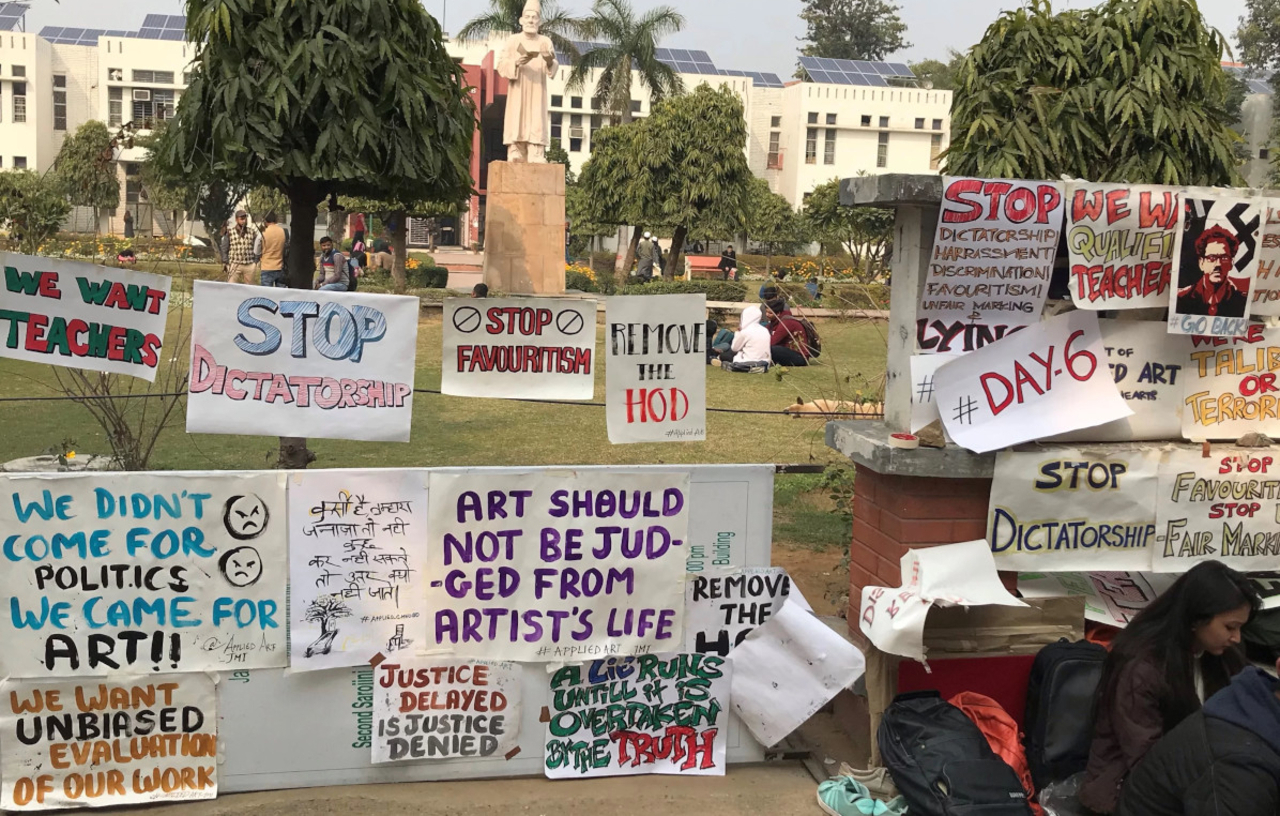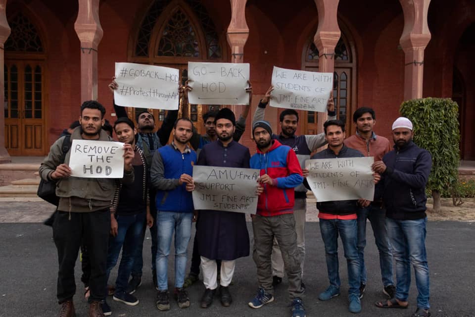 Prof. Hafeez Ahmed stands accused of repeatedly harassing students, in a toxic environment marked with job vulnerability faced by guest faculty, and the apparently unchecked power of a department’s HoD. The current events are unfolding at a campus in the nation’s capital with a long history of student protests, where the student union has been shut down by the administration since 2006, and protests and cases continue against that. Amidst a broader climate marked by targeting of minority institutions in the country, this is a campus with ex-military people employed as campus guards, and police regularly present on campus. Within that, as the current protests focussed an eye on the Fine Arts department, we learnt from students there of an HoD facing accusations of sexual harassment and regional discrimination in grading and otherwise. We learnt a story of administrative inaction. We learnt of a department in which he is the only permanent faculty member, and where the performance game for students is often about being able to suck up to him. Students are calling an end to this. In a way this is a disturbingly familiar story from campuses all around, with specific distinguishing factors. Which makes the protests there all the more important – for the way in which they are connected to such protests elsewhere, and in turn how they can inspire others.