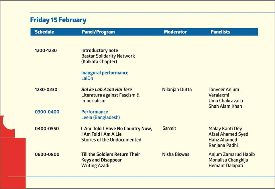 উত্সবে আলোচনা হবে ভারতের মূল ভূখণ্ড ও ভারত অধিকৃত কাশ্মীর, মণিপুর, নাগাল্যান্ডে ভারতীয় সেনার আগ্রাসনের মুখে দাঁড়িয়ে ক্ষমতার চোখে চোখ রেখে তৈরি হওয়া সাহিত্য নিয়ে। “কুচকাওয়াজের তলায় আছে গানের ডায়নামাইট” শীর্ষক এই আলোচনায় উঠে আসবে ভারতীয় নিরাপত্তা বাহিনীর অত্যাচারে কথা, উঠে আসবে মিলিটারির বন্দুকের সামনে দাঁড়িয়ে কী ভাবে তৈরি হয় এক অপরাজেয় লড়াইয়ে আখ্যান। এই আলোচনায় অংশ নিতে কাশ্মীর থেকে আসছেন লেখিকা অনজুম জামারুদ হাবিব। কাশ্মীরের হুরিয়ত কনফারেন্সের সদস্য ও ‘মুসলিম খোয়াতীন মরকজ’ নামে নারী সংগঠনের প্রাক্তন সভানেত্রী অনজুম জামারুদ হাবিবের জীবনের প্রায় পাঁচ বছর কেটেছে ভারত রাষ্ট্রের জেলে। জেল জীবন ও সহ বন্দিদের নিয়ে অনজুম লিখেছেন “কয়দি নম্বর ১০০: ভারতী জিন্দন মে মেরে শব-ও-রোজ কি রুদাদ”। জেল থেকে বেরোনোর পরও আন্দোলনে সম্পৃক্ত থেকেছে অনজুমের জীবন। গড়ে তুলেছেন ‘অ্যাসোসিয়েশন ফর দা ফ্যামিলিজ অফ কাশ্মীরী প্রিজনার্স’। অনজুমের সঙ্গে এই আলোচনায় থাকবেন নাগাল্যান্ডের মোনালিসা চাংকিজা। নাগা সমাজের প্রতিদিনে বাস্তবতার ছবি উঠে আসে মোনালিসার কবিতায়। উত্তর-পূর্ব ভারতের একমাত্র মহিলা সম্পাদক ও প্রকাশক মোনালিসা তাঁর ইংরেজি দৈনিক Nagaland Page-এ লেখেন নাগাল্যান্ডের দৈনন্দিন জীবনের রক্ত, সংঘর্ষ আর প্রতিরোধের কথা। নাগাল্যান্ডের মানুষে আশা আকাঙ্ক্ষা আর তাঁদের আত্ম নিয়ন্ত্রণের সংগ্রামের কথা উঠে আসে মোনালিসার কলমে। আলোচনায় থাকবেন উড়িষ্যার থেকে আসা আদিবাসী কবি হেমন্ত দলপতি। ব্রাহ্মণ্যবাদ, পুঁজিবাদ ও পিতৃতন্ত্রের বিরুদ্ধে সোচ্চার হেমন্ত লেখেন জল জঙ্গল জমিনের লড়াইয়ের কথা, আর সে লড়াইতে সামিল হওয়া জনগণের কথা। লড়াইয়ের সংহতিতে কবিতা লেখার জন্য সামান্য মাইনের চাকরিটুকুও খোয়াতে হয়েছে হেমন্ত দলপতিকে, তবে তাতে অবশ্য দমেননি হেমন্ত। মূলধারার স্থিতাবস্থাকে চ্যালেঞ্জ জানানোই তাঁর কলমের প্রধান দায়িত্ব বলে মনে করেন তিনি।