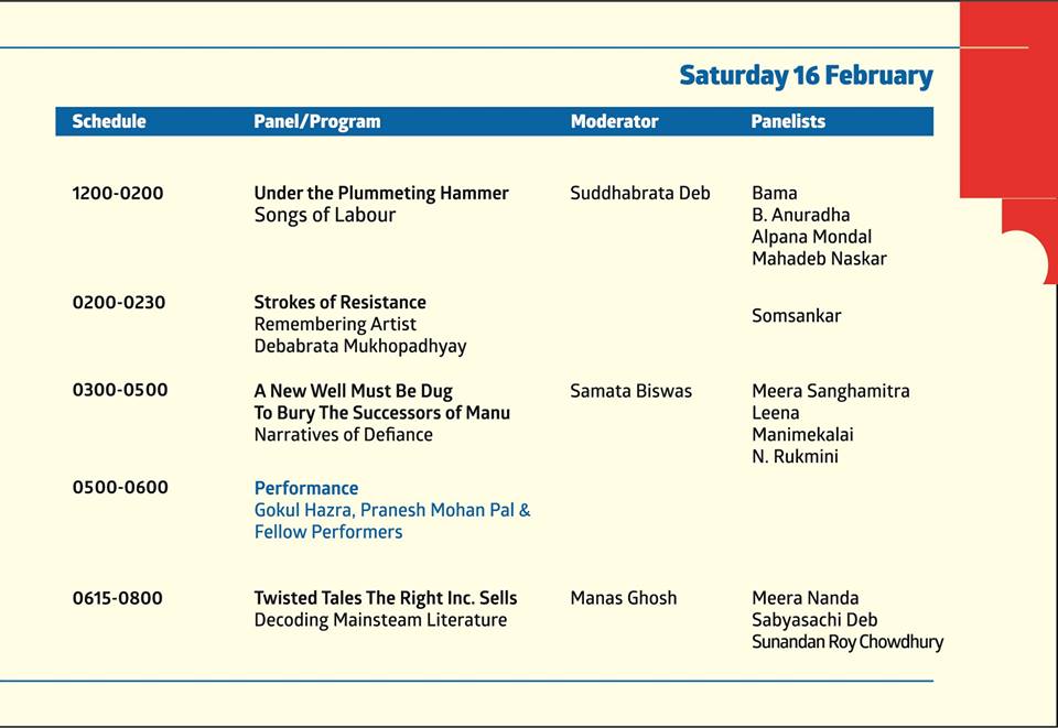 কৃষক, শ্রমিক খেটে খাওয়া মানুষের সাহিত্য নিয়ে কথা হবে “চিমনির মুখে শোনো সাইরেন শঙ্খ/ গান গায় হাতুড়ি ও কাস্তে” শীর্ষক আলোচনায়, কথা হবে চাষাভুষোর সাহিত্য নিয়ে। এই আলোচনায় অংশ নিতে আসছেন তামিলনাড়ুর দলিত নারিবাদী লেখিকা বামা। নিজের সম্প্রদায়ের মানুষের ভাষায় তাঁদের শ্রম, সংস্কৃতি, বিনোদন, বিশ্বাস, ভালবাসা, লড়াই, সংগ্রাম, যন্ত্রণা, যাপন, আশা, স্বপ্ন, আনন্দ আর দুঃখের কথা লেখেন বামা। নিজের লেখায় ব্রাহ্মণ্যবাদী “ভদ্রলোক” এর তামিল ভাষাকে প্রত্যাখান করেন তিনি, লেখেন শ্রমজীবী মানুষের মুখের ভাষায়। বামার সঙ্গে এই আলোচনায় থাকবেন আলপনা মন্ডল ও মহাদেব নস্কর। ক্লাস ফোরে পড়ার সময়ে দাদা ছাত্রবন্ধু কিনে দিতে পারেনি বলে স্কুল যাওয়া বন্ধ হয় আলপনার। অভিমানে ঘর ছেড়ে কলকাতা পালায় আলপনা, আর কোনোদিন ছাত্রবন্ধু কেনা হয়নি আলপনার। জীবনের একটা বড় অংশ কাটে কলকাতায় গৃহ পরিচারিকার কাজ করে। নিজের চেষ্টাতেই একটু একটু করে লেখাপড়া শিখে নিতে চান আলপনা। লিখতে শুরু করেন নিজের জীবনের অভিজ্ঞতার কথা। আলপনার লেখা প্রকাশিত হয়েছে গুরুচন্ডালী ব্লগে। এছাড়াও অন্যের সাহায্য নিয়ে নিজের ব্লগও শুরু করেছেন আলপনা। গুরুচন্ডালী ব্লগের তাঁর লেখার সংকলন নিয়ে বই “চণ্ডালিনী বৃত্তান্ত” প্রকাশের অপেক্ষায়। আলপনার মতোই প্রাতিষ্ঠানিক শিক্ষা থেকে বঞ্চিত থেকেছেন কবি মহাদেব নস্কর। ছোটবেলায় দিন গুজরান হয়েছে “বাবু”-দের বাড়িতে কাজ করে, পরবর্তীতে রিক্সা চালাতে শুরু করেন মহাদেব। সত্তরের দশকে নকশালবাড়ির রাজনীতিতে অনুপ্রাণিত মহাদেব রিক্সা চালানো ছেড়ে সর্বক্ষণের কর্মী হিসেবে যোগ দেন বিপ্লবী সংগঠনে। গ্রেফতার হয়ে জেলে যান মহাদেব, সেখানেই হয় অক্ষর জ্ঞান, কবিতা লেখার শুরুও সেখানেই। মহাদেব, আলপনা আর বামার সঙ্গে এই আলোচনায় থাকবেন হায়দ্রাবাদের নারীবাদী রাজনৈতিক কর্মী ও লেখিকা বি. অনুরাধা। অন্ধ্রপ্রদেশের দলিত পরিবারের বি. অনুরাধার রাজনৈতিক জীবন শুরু ছাত্রাবস্থাতেই। পরবর্তীতে নারী সংগঠনের সর্বক্ষণের কর্মী হিসেবে কাজ করার পাশাপাশি যুক্ত থেকেছেন পত্রিকা সম্পাদনার কাজেও। মাওবাদী কার্যকলাপের সঙ্গে যুক্ত থাকার অভিযোগে চার বছর বিচারাধীন বন্দি হিসেবে হাজারিবাগ কেন্দ্রীয় সংশোধনাগারে কাটে বি. অনুরাধার। জেলবন্দি মেয়েদের জীবন নিয়ে ১৮টি ছোট গল্প লেখেন অনুরাধা। পরবর্তীতে ভিরাসামের পক্ষ থেকে সংকলন আকারে প্রকাশিত হয় সেই বই। শ্রমজীবী মানুষের লড়াইয়ে সামিল হয়ে তাঁদের জীবন খুব কাছ থেকে দেখেছেন অনুরাধা, জেনেছেন তাঁদের ভাষা, স্বপ্ন, আনন্দ আর যন্ত্রণার কথা।