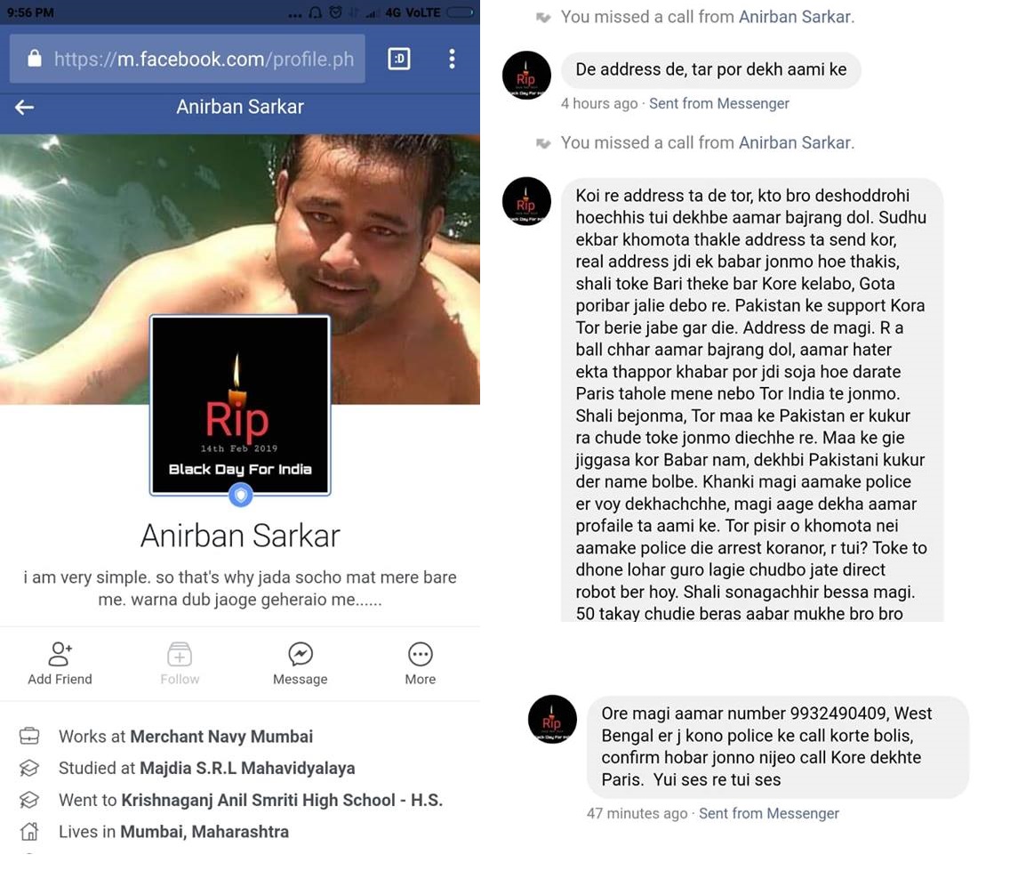 Previously Sarbajit and his group also went to a house in Bidhanpalli in South Khagrabari. The live video of the attack posted by Sarbajit shows that the attack was based on a Facebook post highlighting the rapes and killings of Kashmiris by Indian armed forces. The person who posted the content was at that time in Jadavpur, Kolkata. The abusive mob asked the father to call his son. The father was asked to put the call on loudspeaker and the son was threatened to chant “Bharat Mata ki Jay”. If he didn’t comply, they would ransack his home. The crowd also threatened the father, saying that if his son comes back to Cooch Behar, he won’t be spared. The comments on both the posts are full of abuses and criminal threats. Presently the video has been removed, the reason is unknown. Many of the profiles and groups have removed such videos subsequently – some on their own and few due to violations of “Facebook community standards”.