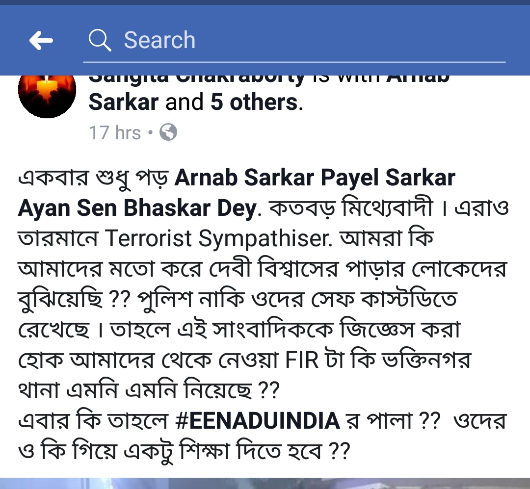 In another similar incident, Arnab Sarkar, an activist of the Hindu Sanhati, attacked Debi Biswas’s home. True to the current practice, the attack was live telecast on Facebook. She tried explaining the long standing dispute in Kashmir which is leading a section of the youth there into ‘terrorism’. She was cut short and a woman in the crowd started mocking her. A man asked her why she did not write about the Kasmiri Pandits. The crowd started agitating terming her as ‘anti-national’. As the police intervened, the crowd started lecturing the police about their duty against such ‘anti-nationals’. As the police tried to mitigate the brawl the agitated crowd started raising slogans of Bharat Mata ki Jai and ‘Deshdrohider Chaamra Gutiye Nebo Aamra’ (We will skin the traitors of the country). A flurry of abuses and threats poured in again over the comments. This video garnered around 2888 shares and around 2.3K likes on the main profile. Arnab Sarkar was accompanied by Ayan Sen, Patel Sarkar and Bhaskar Dey. The video was shared by Debtanu Bhattacharya, President of Hindu Samhati. Hindu Samhati organized several candlelight marches in different parts of West Bengal.