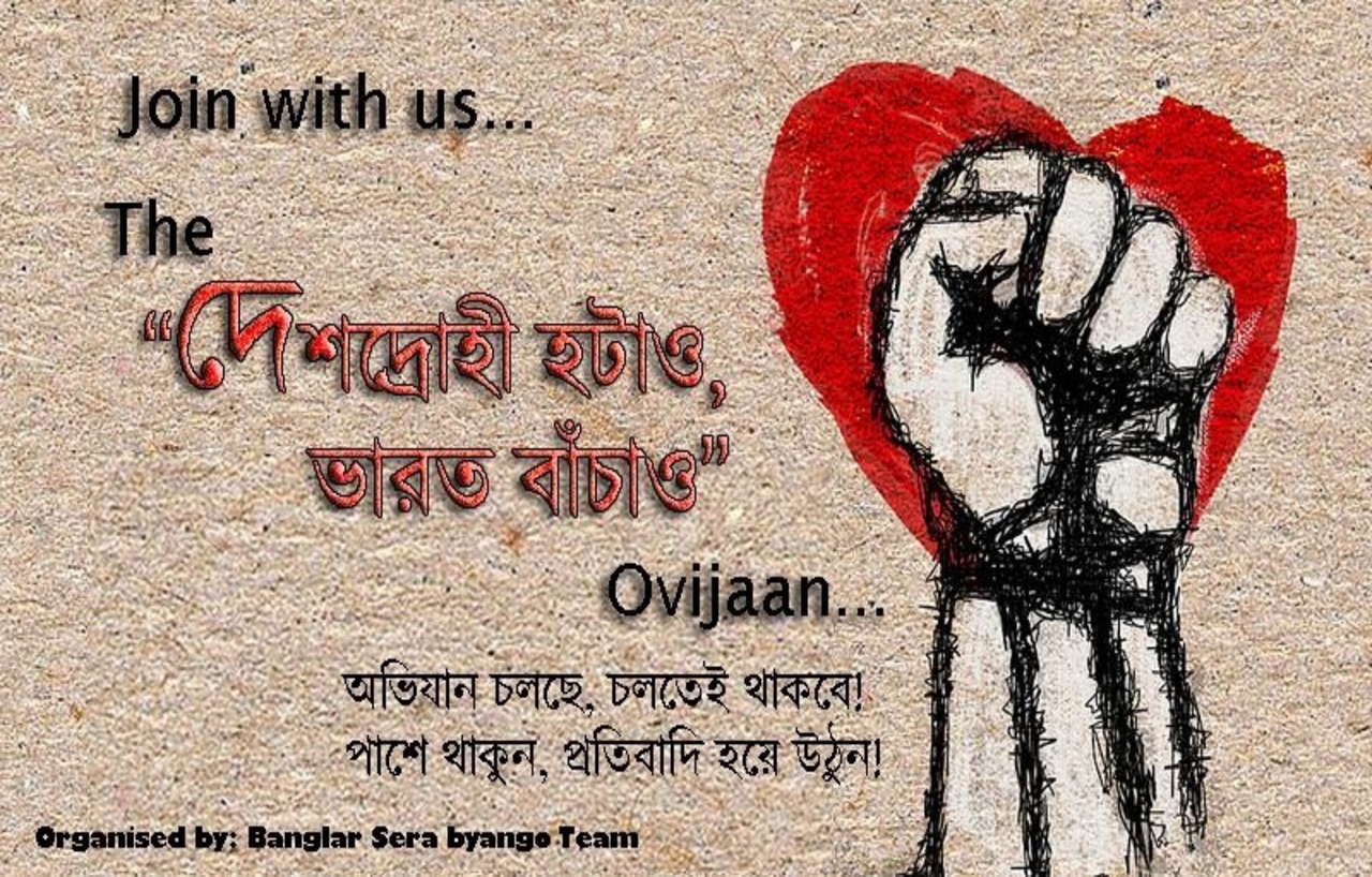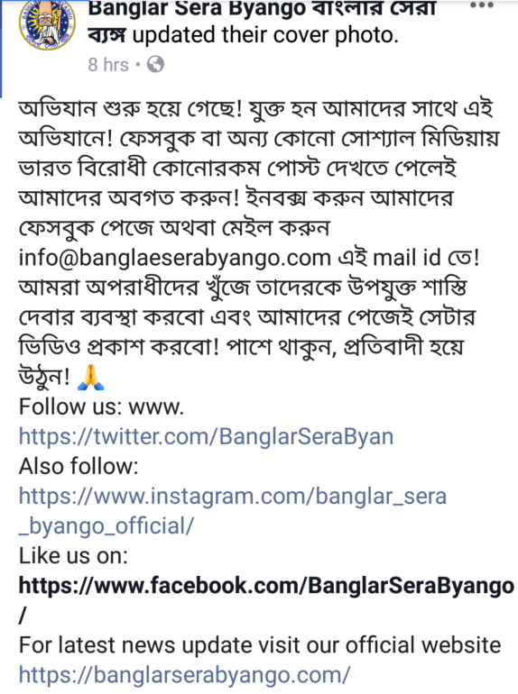 Similar campaigns were being carried out by the Facebook page “Banglar sera Byango”. This page has nearly 1 lakh likes. The group started a campaign called “Deshdrohi Hatao Bharat Bachao.” They started sharing the live videos from profiles of different ‘nationalists’. The group advertised an email id where Facebook users or others can send information about profiles that they consider ‘anti-national’. The group continued with its public lynch call, slander campaign, character assassination, inflammatory posts and fake news (from a website with the same name). On 18th February, the group posted an update, “Everyone stay tuned, got another anti-national in Habra” [translated]. Another FB update said, “Going to unmask another anti-national. Will be LIVE by 9. Stay tuned.” On Tuesday the group published a post mentioning that they are discontinuing the campaign as they are being termed as RSS goons and that some people are trying to raise money in their name. Groups like “Bonno ছেঁচরা” which usually runs pro-BJP, pro-Modi Hindutva campaign shared photoshopped images slandering the woman from Birati, accompanied by hate campaigns.
