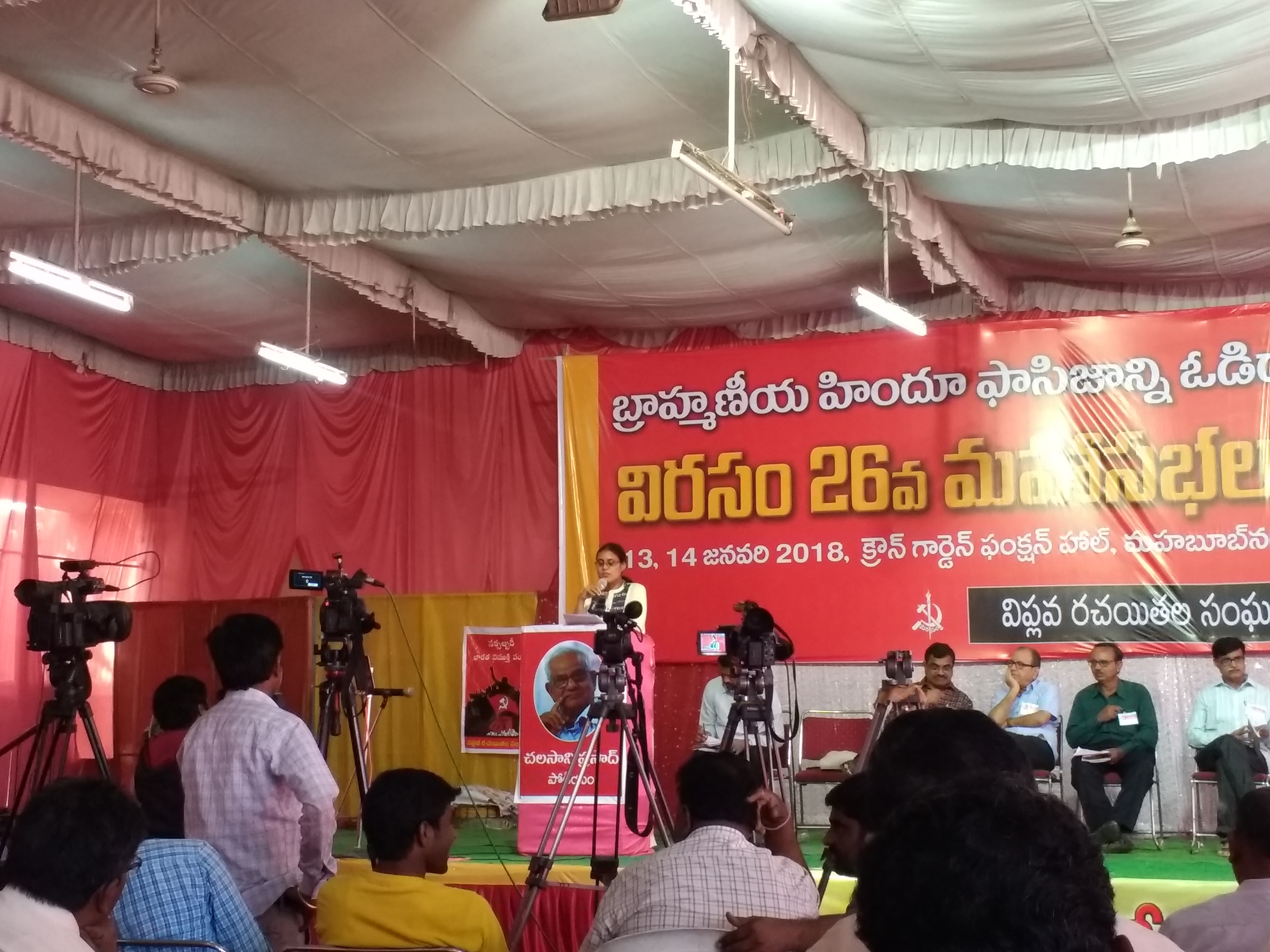 V: I came here as a representative from VIRASAM. It is a good forum. We were actually thinking of something like this when we boycotted the government organised literature festival in Hyderabad last year. In VIRASAM’s history this was the third time. Firstly, when Sri Sri was founding president, and in the context of the Srikakulam struggle against the brutal onslaught of the government on people, leaders and poets of revolution, VIRASAM boycotted the world Telugu literary conference stating that it is organised by blood soaked hands. And a second time in 2012 December, during my tenure as Secretary, when the Telangana statehood struggle was raging, and as usual there were many encounter killings and unanswered questions by the state, we called for a boycott. Most of the Telangana activists came along with us. And people who are genuinely interested in language and literature, in Telugu language. When the government is acting in the interests of corporates and does not respect any local languages or cultures and related things, everything is corporatized, there’s English everywhere and no space for Telugu – this kind of environment is there. Actually the ruling class has no concern for people’s culture or people’s language. So in this regard we have boycotted the festival. And lastly, 2016 December, that was the third time, and we held a protest, and were arrested. So there was a question from writers in the Telugu sphere: why can’t you create an alternate forum? We gave an appeal to writers also, to boycott these sponsored festivals, so they asked about an alternate forum. There has to be a forum for writers to express art and culture … However writers want to reach the masses, take their literature to regular people, so there should be a forum. They said we’re using whatever forum there is, government or corporate, but if you create a forum we also will join. So we were thinking of something like this. And last year I heard about this festival. And Varavara Rao and Kalyan Rao came here last year from VIRASAM. It was good listening to their experiences here. Incidentally Varavara Rao is now in prison. And in that context I want to come here and represent the poets who got arrested, their voice coming out from prison in the form of poetry, in the form of literature. So this is my interest in appearing here now.