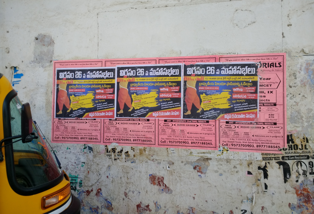 (Abhishek Bhattacharyya (obhishekbolchi@gmail.com) is a doctoral student and activist; all photos are by him, except where specified otherwise. Cover image: VIRASAM posters on a wall in Mahbubnagar announce their 26th general conference, on 13th-14th January, 2018 – the overall theme being to fight “Brahminical Hindu fascism”)