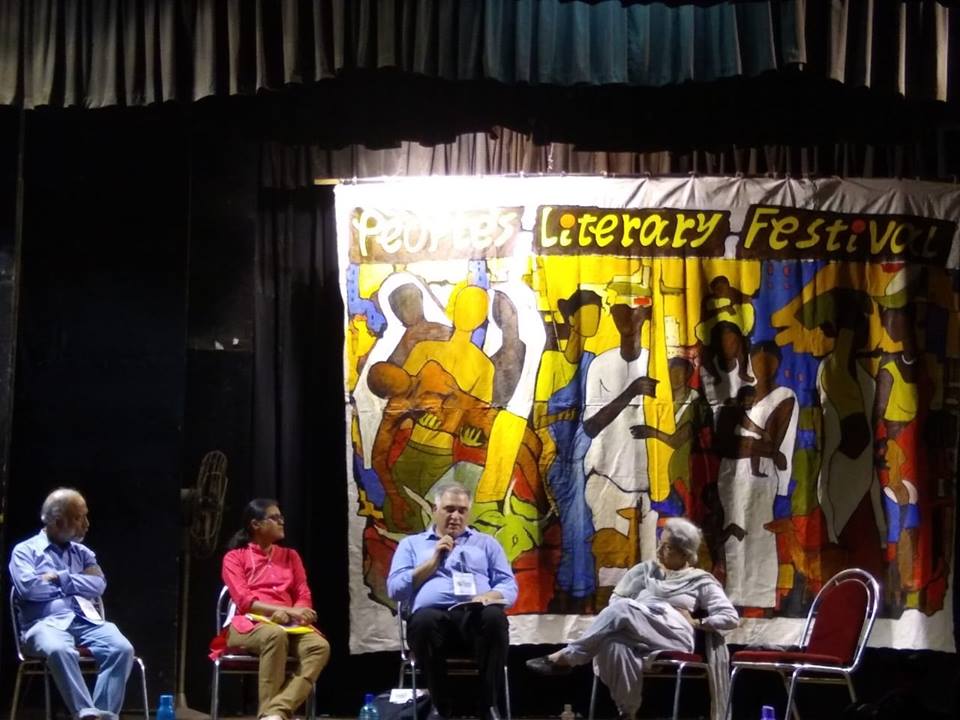 P Varalakshmi in red at the People’s Literary Festival, Kolkata (15-16 February, 2019). To her right, human rights activist Nilanjan Dutta, moderator. To her left, with the mike, Dr. Shah Alam Khan, author of The Man with the White Beard . To his left, historian Professor Uma Chakravarty. The panel was titled: “Bol Ke Lab Azad Hai Tere: Literature Against Fascism and Imperialism”. Photo courtesy Bastar Solidarity Network – Kolkata Chapter.