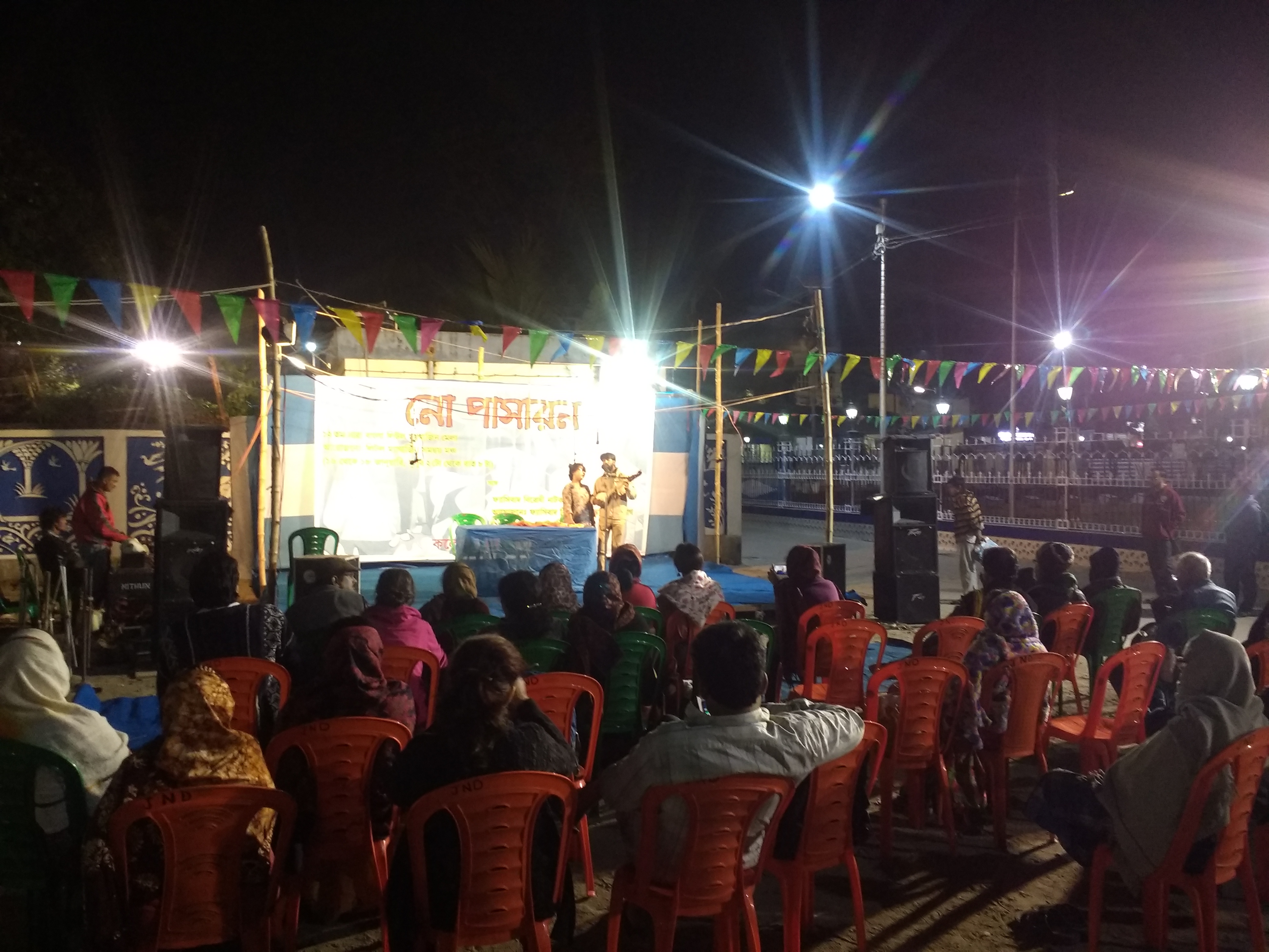 “Obokkhoy” has been working as an organisation in Chakdaha (Nadia district) for 21 years now, I learnt from Mrinal Bagchi, who is an active member. They’ve been teaching kids from economically disenfranchised and other marginal backgrounds, with about a hundred students currently enrolled. They do not accept any funding from the government, NGOs or corporations, Mr Bagchi continued. They also organise free medical camps in different places, I learnt. And different “third theatre” groups – such as Pathasena, Satabdi, Ayna – have worked with them at different points. They have relationships with 14 friendly publication houses who give them books at different points, with which they set up book stalls in Chakdaha, and also participate actively in the annual Chakdaha Book Fair. Chakdaha also has prominent proscenium theatre groups, and a month long theatre festival, but the plays there aren’t affordable for any of these people, Mr Bagchi said, while discussing their multipronged work on education, health, reading practices and performance. Such projects of staying in various places and educating kids itself has a long history within the Indian left, and is a story that needs to be told. In this instance, I was meeting them in the context of a performance by some of their students at the festival. Directed by “Chena Adhuli”s Rajat Das (Bapi), and scripted by Dulal Kar, the play was called “Ashroy” (Shelter).