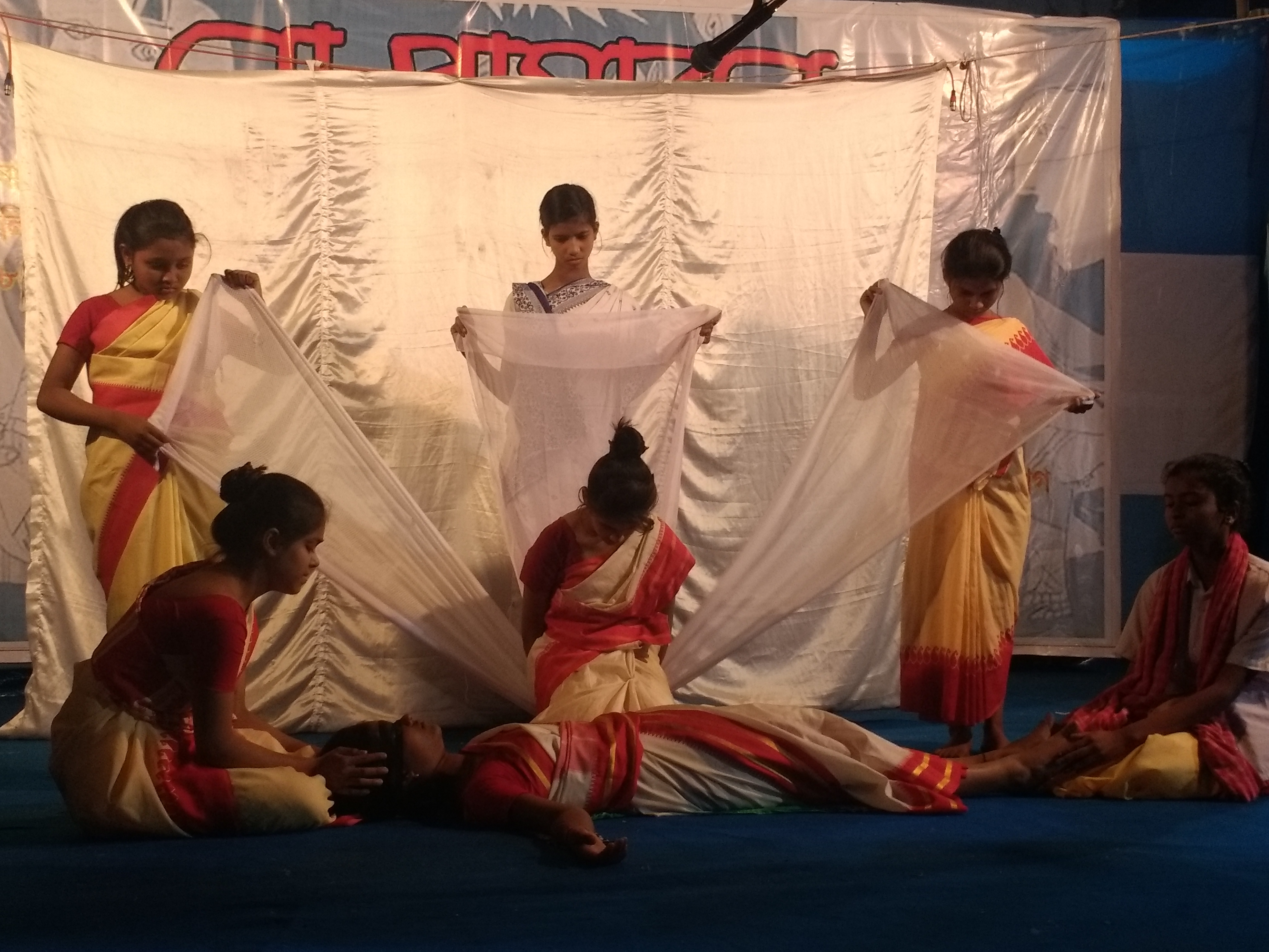 I accompanied my friend, Nandini Dhar, who is also the co-editor of a little magazine, as she spoke to the young actors, mostly girls – all between 12 – 16 years of age. They discussed their experiences of workshopping plays, and told us about a play they’d themselves developed in the process. This play had begun at a Saraswati puja adda, where news arrives that a woman had gone missing, and then all the women in the locality organise in protest, take out a rally, face ridicule from neighbours, but finally manage to persuade and prevail in some way. The whole process of conversations and theatre games, including developing this earlier play, had gone on for over three months, they said, before they started work on this play by Dulal Kar over another two and half months.