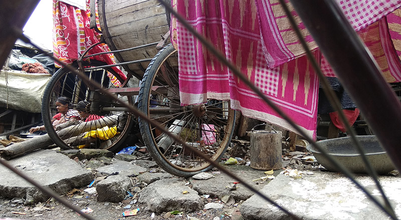 ১২ নম্বর বস্তির বাসিন্দা সঞ্জয় দাস জানাচ্ছেন, এমনকি বস্তি খানিক পরিচ্ছন্ন রাখার চেষ্টায় স্থানীয় প্রশাসনের কাছে একটা ডাস্টবিন বা ভ্যাটের আবেদনও করা হয়েছিলো। মেলেনি সেইটুকুও। ফলত চরম অস্বাস্থ্যকর অপরিচ্ছন্ন পরিবেশে বাস করতে বাধ্য হচ্ছেন তাঁরা। শিশুরা ওই নোংরা আবর্জনার স্তুপ থেকেই খেলার সরন্জাম খুঁজে নেয়, আদুর গায়ে অথবা শতচ্ছিন্ন জামায় খুদে খুদে শরীরগুলোকে ঢেকে। ওই বস্তিরই আর এক বাসিন্দা গোপাল কর রিক্সা চালান। প্যাডেল রিক্সা। যে ‘ফণী’ না আসায় কলকাতার মধ্যবিত্ত ভারী মুষড়ে পড়েছিলেন, তার হালকা বৃষ্টি আর খানিক হাওয়ার জেরেই উড়ে গেছে তাঁর বাড়ির চাল। ভেঙে পড়েছে কঞ্চির দেওয়াল। পরিবারের ২২ দিনের শিশুটি তাই ৩৯ ডিগ্রি তীব্র দাবদাহর মধ্যে তাই একটা ন্যাকাড়ায় মুড়ে মাটিতে শুয়ে তারস্বরে চেঁচিয়ে যাচ্ছে। তরুণী মা কোনওরকমে তাকে শান্ত করার চেষ্টা চালিয়ে ব্যর্থ। পরিতক্ত, কারোর ফেলে দেওয়া, কুড়িয়ে পাওয়া ভাঙাচোড়া প্লাস্টিকের টুলে বসে তিনি শুধুই উদাস অসহায় দৃষ্টিতে চেয়ে আছেন সন্তানের দিকে। গোপাল দা আর বৃদ্ধ বাবা মা তখন জোর কদমে জোড়াতালি দিয়ে কোনওরকমে ধ্বংসাবশেষ থেকে গড়ে তোলার চেষ্ট করে চলেছেন ঝুপড়িটুকু। যদি রাতের মধ্যে ছাউনিটুকুও গড়ে ফেলা যায়, মাথাগোঁজার ঠাঁই মিলবে সদ্যজাতর। কাজ করতে করতেই গোপাল দা জানালেন, এখন ব্যাটারি রিক্সার যুগ। প্যাডেল রিক্সার তুলনায় দ্রুতগামী। খানিক আরামদায়কও। তাই সওয়ারিরা আজকাল প্যাডেল রিক্সা চাপেন না। অথচ এক একটা ব্যাটারি রিক্সার দাম ৬৫ হাজার থেকে এক লাখ। কোথায় পাবেন অত টাকা? যদি সব বেচে ধারদেনা করে কেনাও হয় রিক্সা, তার রক্ষণাবেক্ষণের যা খরচ তা সামলাবার ক্ষমতা নেই গোপাল দা, তাঁর মত অনেকেরই। বিদ্যুতই নেই, সেখানে ব্যাটারি চার্জ দিতে যেতে হয় কেষ্টপুর। মাস গেলে খরচ ১২০০ থেকে ১৫০০ টাকা। কে জোগাবে সেই খরচ?
