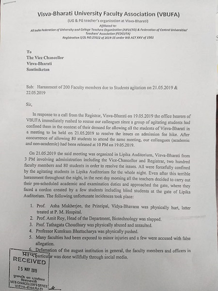 প্রতি বছরের মতো এবছরও বিশ্বভারতী ভর্তি প্রক্রিয়ার জন্য বিজ্ঞপ্তি বের করে, ৮ই মে, ২০১৯ তারিখে। উক্ত বিজ্ঞপ্তিতে ভর্তির আবেদন পত্রের দাম একধাক্কায় ২ গুন (৫০০ টাকা থেকে ১০০০ টাকা), সার্ক অন্তর্ভুক্ত দেশের ছাত্রছাত্রীদের ক্ষেত্রে ১০ গুন (৫০০০ টাকা), ও অন্যান্য দেশের ক্ষেত্রে ১০ গুন (১০০০০ টাকা) বৃদ্ধি পেয়েছে। এই আবেদন পত্রের এত পরিমান মূল্য বৃদ্ধির পিছনে যৌক্তিকতা কি? যেখানে বিশ্বভারতী সারা দেশ জুড়ে কোনো প্রবেশিকা পরীক্ষা চালায় না। কেন্দ্রীয় অনেক বিশ্ববিদ্যালয়ে এখনো অবধি ভর্তির জন্য পরীক্ষা ব্যাবস্থা চালু আছে। সেই সমস্ত বিশ্ববিদ্যালয়গুলো সারা ভারত জুড়ে পরীক্ষা কেন্দ্রে বা অনলাইনের মাধ্যমে ভর্তির পরীক্ষা নেয়। সেই সমস্ত কিছু করবার জন্য যে কিছু অর্থের প্রয়োজন সেটা স্বাভাবিক। কিন্তু বিশ্বভারতী তো তার ভর্তির পরীক্ষার পর্ব (VBCAT) সেই কোনকালে বন্ধ করে দিয়েছে, এখন সবটাই হয় “অটোজেনারেটেড অনলাইন”-এর মাধম্যে, উচ্চমাধ্যমিকের নম্বরের উপর ভিত্তি করে।