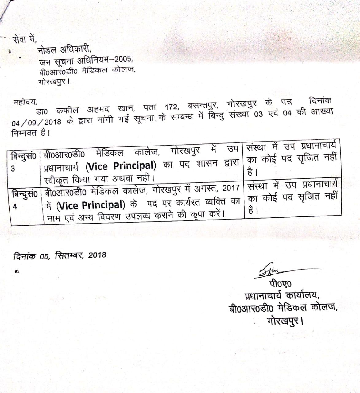 Response to an RTI application by Dr Khan, that shows that there is in fact no position of Vice-Principal at the medical college.