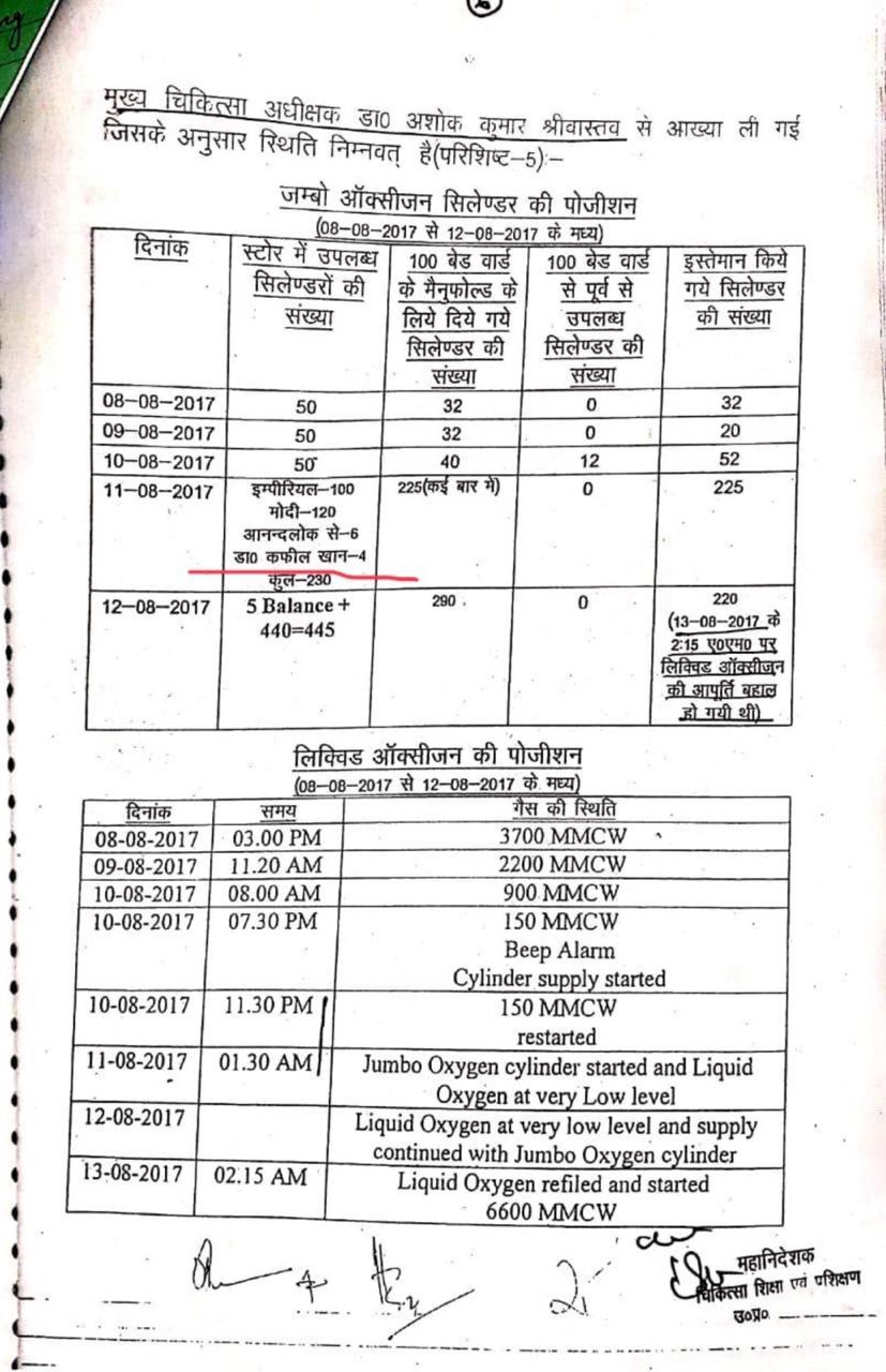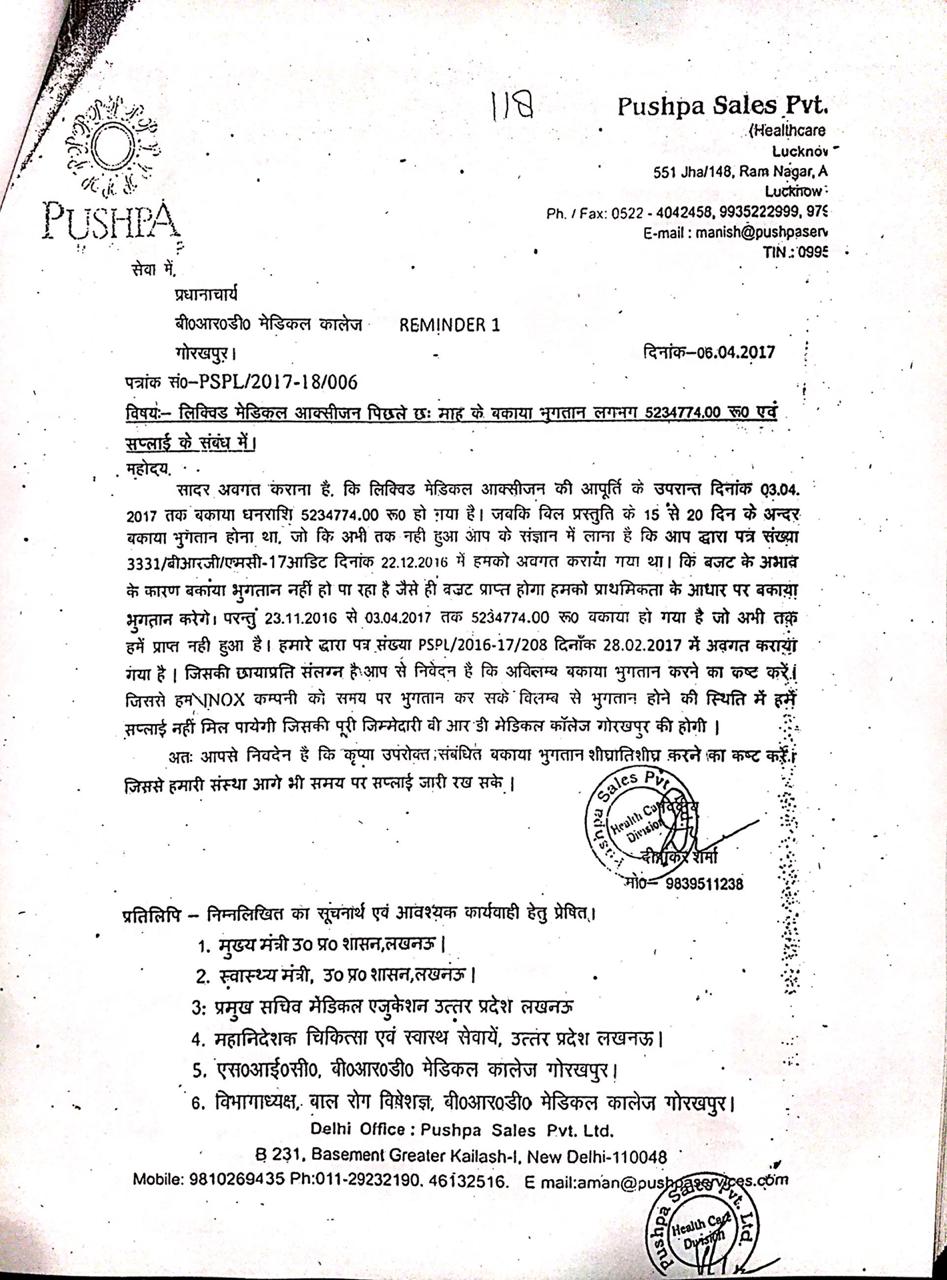 I will show you some papers … See on 6th April, 2017, this letter, addressees include the Chief Minister and Health Minister, and the incident happened on 10th of August, so there’s April, May, June, July that went by. And this is not the first letter, 14 similar letters we have, from Pushpa Sales, who were the suppliers of liquid oxygen, they were asking for their dues, saying they’d stop if dues weren’t paid. But they didn’t pay, they wanted 10% commission – all of this the supplier has given in writing to the court.