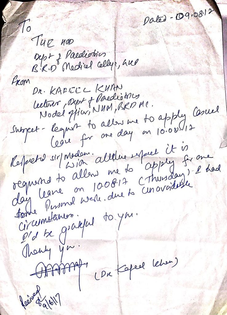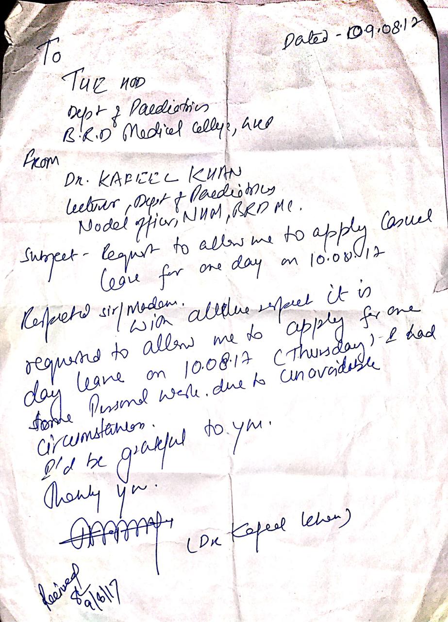 Leave application for the 10th of August, 2017. Dr Khan said that he was on leave on the 10th, and only came to the hospital at night after hearing of the emergency over WhatsApp.