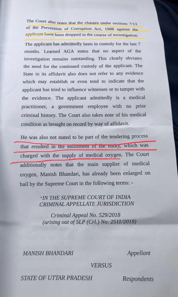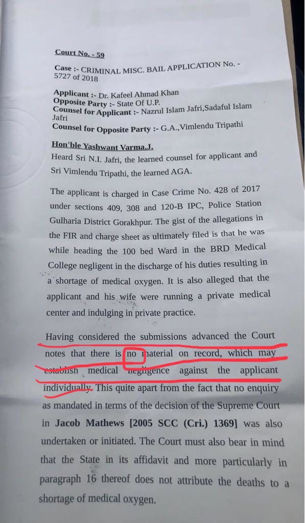 K: Legal battle is complicated actually. It starts from the lower court of Gorakhpur, to Allahabad High Court, to Supreme Court. The High Court, when they gave me bail, they have clearly written: “having considered the submission advanced the court notes there is no material on record which may establish medical negligence against the applicant individually.” [stress added by Dr. Khan, while reading from the document] There is no evidence. Still Yogi’s Government has put charges under 308 on me. 308 is for culpable homicide. That is going on now. When they put me behind bars they placed about ten charges on me, including corruption charges. Those have been dropped by the court, [he reads out from the judgement:] “The court also notes that the charges against … under the … Prevention of Corruption Act against the applicant have been dropped in the course of investigation, and that court also noticed that he was not stated to be a part of the tendering process that resulted in the enlistment of the entity which was charged with the supply of medical oxygen.” So the court has dropped all the charges. (laughs) But still the lower court is not listening. I have submitted this to the lower court, that the High Court has given me a clean chit, please close my file. But the lower court, there is no judge to hear my file, so the file is still open. Every 14 days I have to go, or my advocate goes. Then I have one more case in Bahraich, if you remember, there were 78 deaths in September, 2018. And Yogi said that it was all mysterious disease. So I went there and found out most of them were encephalitis cases, and I wanted to do a press conference, but before that they arrested me, saying I have gone to the hospital and created a ruckus. They kept me behind bars for one month. These two criminal cases are going on against me, in the lower court. Then in High Court I am fighting two cases. One is against my suspension. On 7th of March, 2019, High Court has given an order to the Yogi government that they should decide on my suspension within 90 days. Actually Supreme Court rule is that you can’t suspend a government employee for more than 90 days. It’s already two years now. Anyway, the 3 months from the High Court order deadline was June 7th. But they have not replied to my letters or the court order. So I am moving for contempt of court against the Yogi government in the Allahabad High Court. Another battle I am fighting in the Allahabad High Court is regarding my brother who was shot on 10th June, 2018. It’s already more than a year, and there has been no investigation, no chargesheet, no arrests. And the assault happened when the Chief Minister was present only 500 metres away, at the Gorakhnath temple. So that fight I am fighting. Then in Supreme Court I moved for the same suspension. Supreme Court has ordered on 10th May, 2019 – a double bench of Justice Kaul and Justice Indira Banerjee – that Yogi government should pay all my suspension allowance. That is around 16 lakh rupees. I have given the letter to the Principal and the DGMA and the Health Minister. Because I have to also live, I have to earn my livelihood, how long can I go with my brother and all. But they did not give the money. So I am moving Supreme Court for contempt proceedings against the Yogi Government. My lawyers in the Supreme Court are Meenakshi Arora and Fuzail Ayubi. So this is the legal battle.