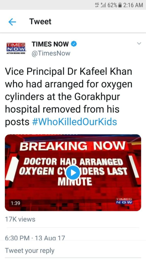 Screenshot of a media report claiming that Dr Khan was the Vice Principal, suggesting he had some position of administrative responsibility, and hence culpability for the lack of liquid oxygen cylinders. On the contrary, Dr Khan said that he was the junior-most doctor on the faculty