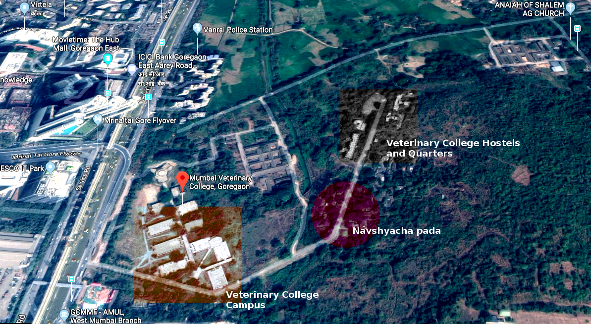 Navshyacha pada – one of the 27 Adivasi padas in Aarey forest, has 70 to 75 houses. In 1974, the Government transferred an entire chunk of land including the Navshyacha pada itself, to the Bombay Veterinary College. “In 1974, when they started the construction of the veterinary college, we also worked for the construction work as begari [slave] workers,” said a lady from the tribal community of the Naushyacha pada. People from the pada who worked for the college construction were paid Rs. 10 a day for working for 8 hours. “We thought we will get some job in this college and will earn some money. But later we realized that they basically took away our land and had no concern for our well-being. In fact, they are denying even our basic rights like water and electricity,” she continued.