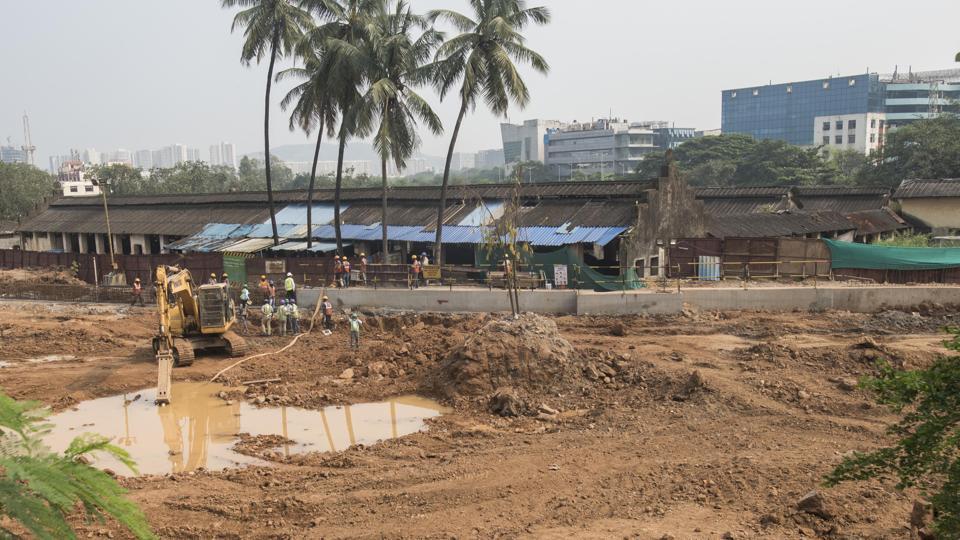 Metro carshed construction work at Parjapur Pada. Photo courtesy: Satyabrata Tripathy/Hindusthan Times.