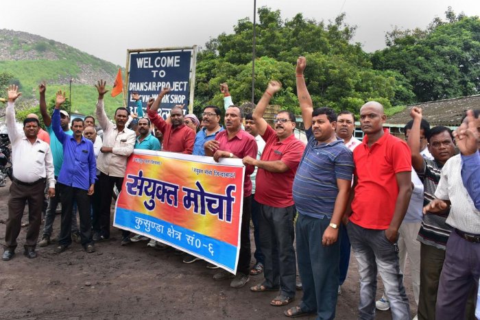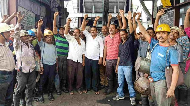 দেশব্যাপী কয়লা ধর্মঘটে শামিল ভারত কোকিং কোল লিমিটেড (বি সি সি এল)-এর কর্মচারীদের বিক্ষোভ প্রদর্শন। ঝরিয়া, ঝাড়খণ্ড (ছবি: পি টি আই)।