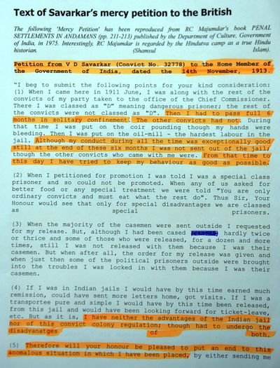 ১৯১১ সালে জেলে ঢুকে, কয়েক মাসের মধ্যেই, ব্রিটিশ-শাসকের কাছে ক্ষমা প্রার্থনা করে লেখেন তাঁকে যেন নির্দিষ্ট সময়ের আগেই মুক্তি দেওয়া হয়। আন্দামানে সেলুলার জেলে থাকাকালীন এইভাবে একাধিক বার ব্রিটিশরাজের কাছে ক্ষমা চেয়ে চিঠি লিখেছিলেন। সরকার কান দেননি যথারীতি। এগারোর পর ১৯১৩ সালে আবার লেখেন। ১৯২১-এ তাঁকে দ্বীপভূমি থেকে ভারতীয় মূল ভূখণ্ডের জেলে স্থানান্তরিত করার আগে পর্যন্ত বারবার ব্রিটিশ-প্রভুর কাছে ক্ষমা চেয়ে চিঠি লিখেছিলেন একদা-বিপ্লবী। শেষমেশ ‘রবার্ট ব্রুস’ সফল হলেন। ব্রিটিশ তাঁর মুচলেকা গ্রহণ করে ১৯২৪-এ মুক্তি দেন। মুচলেকায় পরিষ্কার জানিয়ে দেন, তিনি ভারতের স্বাধীনতা সংগ্রাম থেকে সরে দাঁড়াবেন এবং চিরকাল ব্রিটিশ ঔপনিবেশিক প্রভুর জো-হুজুর হয়ে থাকবেন।