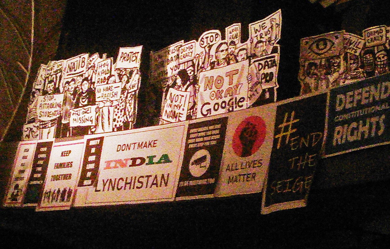 এ বছরের ডায়ালগস্ বাস্তবিকই রাষ্ট্রের দিকে আঙুল তুলছে। সুমন্ত্র ও তাঁর দলের করা আর্ট ইনস্টলেশন বসুশ্রী সিনেমা হলের প্রতিটি ছত্রে সেই বাস্তবকে তুলে ধরেছে। প্রেক্ষাগৃহে ঢোকার মুখ থেকে দু’টি তলা জুড়ে করা এই ইনস্টলেশন বহুদিন মনে রাখার মতো। কলকাতার কোনও চলচ্চিত্র উৎসব সাম্প্রতিক অতীতে একইসঙ্গে এরকম সাহসী ও শৈল্পিক ইনস্টলেশন দেখেনি। নজরদারি আমাদের প্রতিদিনের জীবনে ঠিক কতটা আষ্টেপৃষ্ঠে বেঁধে রেখেছে আর কতটা জোর গলায় আমাদের এই দাঁত-নখ বের করা রাষ্ট্রব্যবস্থার বিরূদ্ধে একজোট হয়ে রুখে দাঁড়াতে হবে তা সিনেমা দেখতে ঢুকে এই আর্ট ইনস্টলেশন-এর মধ্যে বসে আরও একবার অনুভব করে নেওয়া যায়। শ্রেয়তমা দত্তর তৈরি করা উৎসবের সিগনেচার ফিল্ম-এও এনআরসি, রাজনৈতিক পরিচিতির নিরিখে তকমা এঁটে দেওয়া, ক্রমশ বিভিন্ন পরিচিতির নৌকাগুলির ভেসে যাওয়া মধ্যে দিয়ে এক অসম্ভব দোলাচলের মধ্যে আটকে যাওয়া এই সময়ের ছবিই ভেসে ওঠে।