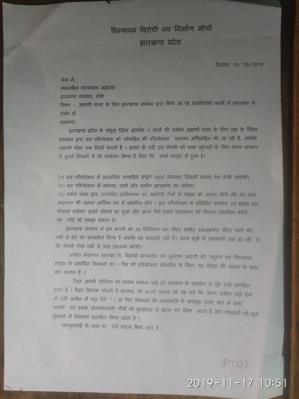 Applications have been submitted to various government offices through personal as well as collective efforts. On 18.09.2018 the Jharkhand State Branch of the Anti-Eviction Nava Nirman Morcha submitted a complaint to the Governor asking for remedial measures to counter the anti-people steps being taken by the government for Adani Power. We spoke to the local representatives of said organisation. He said that land is being forcefully acquired for Adani to produce electricity which would be exported to Bangladesh. His organisation had sent a complaint to the Governor seeking redressal. They had not even received a reply, let alone redressal. The representative also informed us that some of them, including Anil Hembram, Rakesh Hembram, and Girinath Tudu had previously sent letters to the Governor on 12.09.2018 informing him about the ongoing violations of constitutional rights, and of the Santhal Pargana Tenancy Act, 1949. Letters were also sent to administrative officers of the district, and to the Chief Minister. Nothing changed.