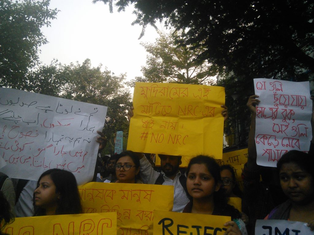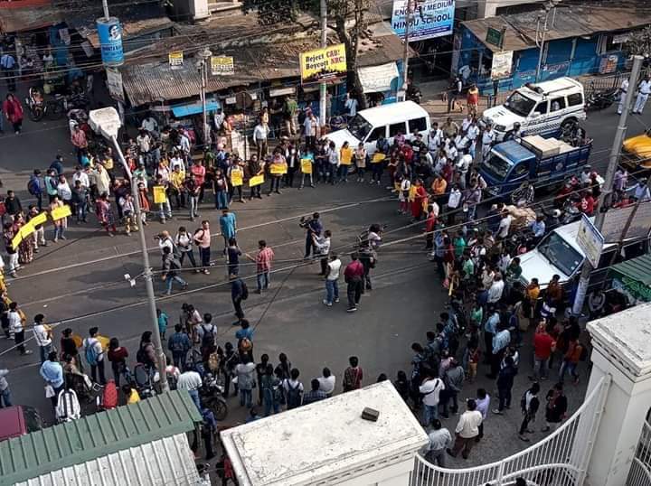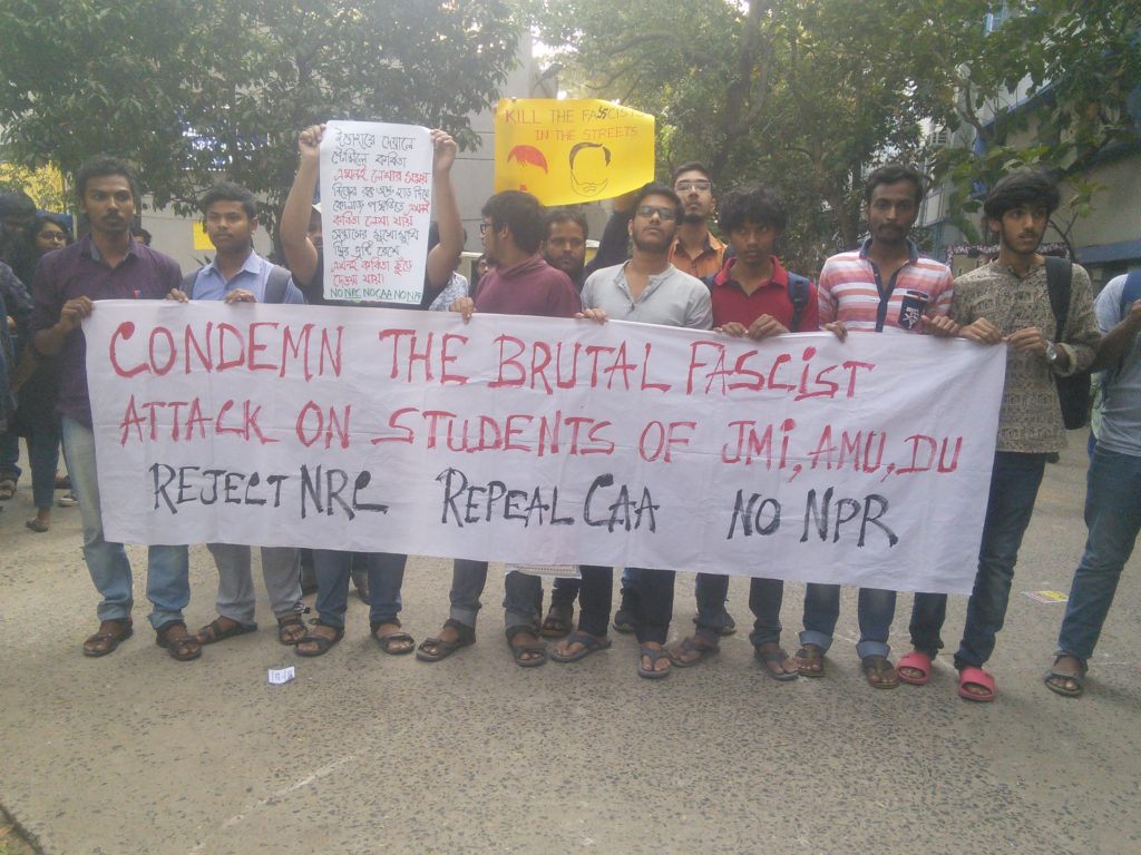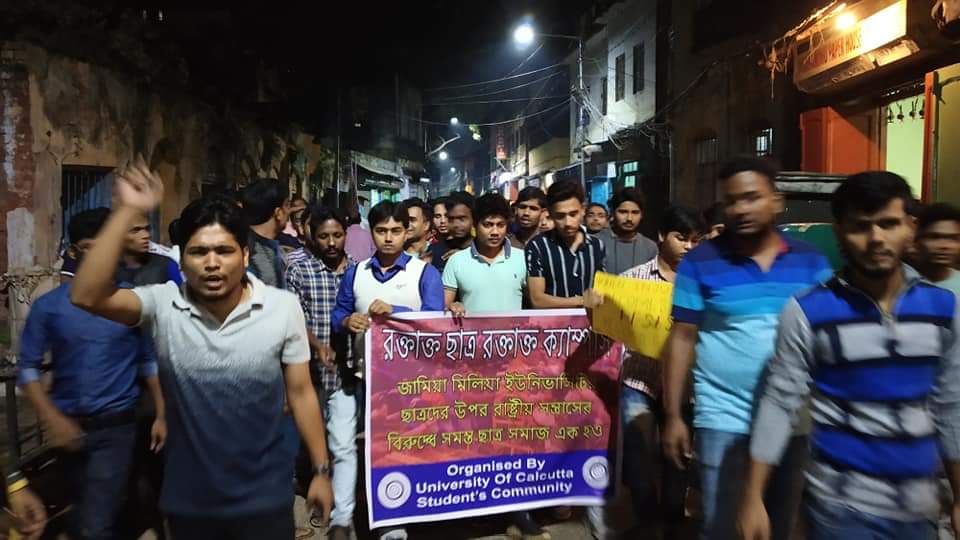 Students from several educational institutions in West Bengal marched in support of their counterparts in Jamia Millia Islamia University (JMI), New Delhi and Aligarh Muslim University (AMU), Uttar Pradesh. Students of Aliah University, Visva Bharati, Jadavpur University, Calcutta University and Presidency University condemned the brutal action of the police and demanded revocation of the communal Citizenship Amendment Act (CAA), 2019 and non-participation in National Register of Citizens of India.
