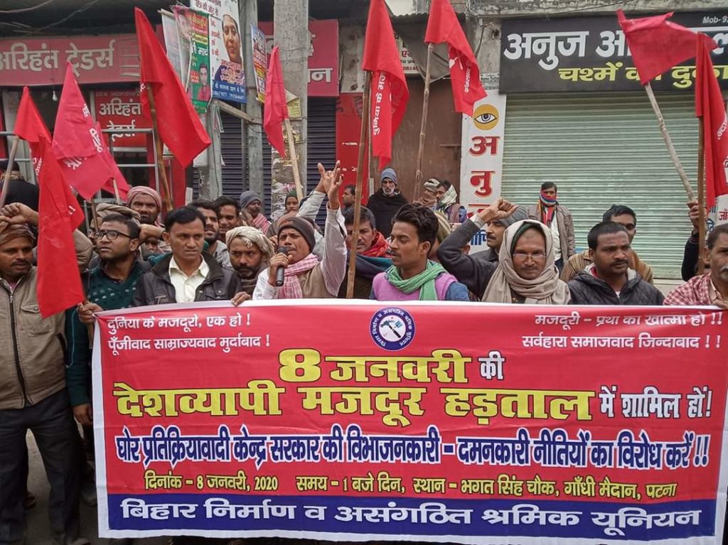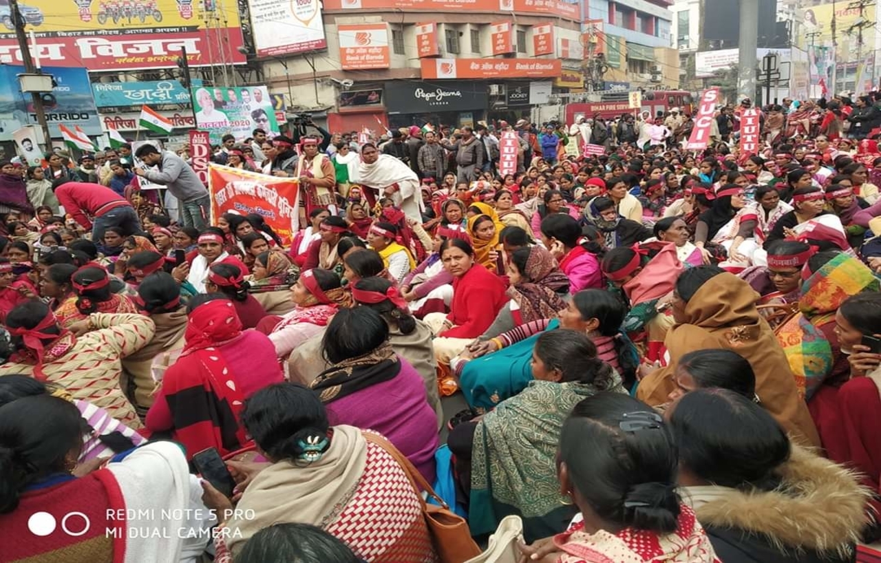 The gathering was so huge that the leaders have to struggle a lot to start the meeting. Representative of various trade unions like Gaznafar Nawab (AITUC), Ganesh Shankar Singh (CITU), R.N.Thakur (AICCTU), Chandra Prakash Singh (INTUC), Ajay Kumar Sinha (IFTU- Sarwahara), Suryakar Jitendra (AIUTUC), Virendra Mahto (UTUC), Satyanarayan Singh (CPI), Awadhesh Kumar (CPI-M), Dhirendra Jha (CPI-ML), Nripen Krishna Mahto and leaders of Anganwdi and ASHA workers like Kumar Bindeshwar, Kaushlendra Kumar, Punam, Soni Singh and others addressed the gathering. Speakers attacked the anti-labor policies of the Modi government and were particularly critical of the four labour codes, which according to them are an instrument to throw workers in a slave like situation. While condemning the brutal attack on JNU students and criticizing the CAA/NRC, the union leaders said that unless these anti-people policies are withdrawn by the government, our struggle will continue and much bigger struggles are awaiting this government.