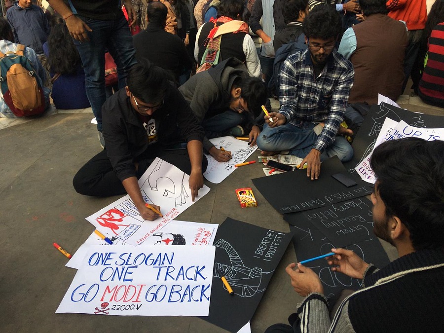 এসে পৌঁছলাম নন্দন চত্ত্বরে। সেখানে তখন মূলত ছাত্রছাত্রদের ভিড়। চলছে পোস্টার লেখা আর স্লোগান তোলা। ম্যাটাডোর-এর মাথায় উড়ছে ভগৎ সিং আর রোহিত ভেমুলার ছবি আঁকা বিরাট পতাকা। পুলিসের সতর্ক চোখের সামনেই জোর গলায় স্লোগান উঠছে – ‘সরফরোশি কি তমান্না অব হমারে দিল মে হ্যায়/দেখনা হ্যায় জোর কিতনা বাজুয়ে কাতিল মে হ্যায়’।