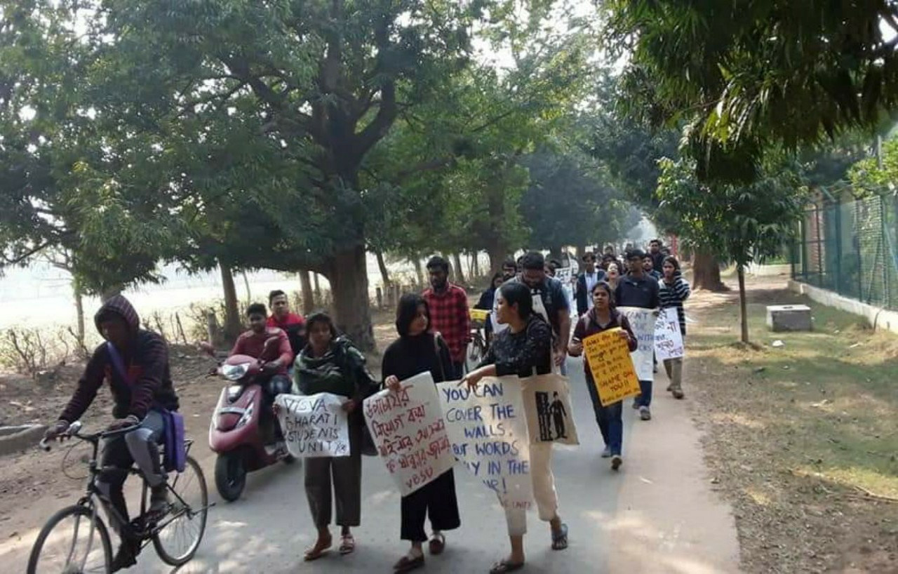 গত ১৫ই জানুয়ারি বিশ্ববিদ্যালয়ের সিএএ বিরোধী আন্দোলনের অন্যতম মুখ ছাত্র শুভনাথ, স্বপ্ননীল ও আরও কয়েকজন ছাত্রর উপর লাঠি, পেরেক গোঁজা বাঁশ, ধারালো টিউব ও অন্যান্য অস্ত্র নিয়ে চড়াও হয় অচিন্ত্য বাগদী, সাবির আলি বক্স, সুদীপ্ত গড়াই ও তাদের বেধড়ক মারতে থাকে। আক্রমণকারীরা সকলেই আকন্ঠ মদ্যপান করেছিল ও সেই অবস্থায় প্রথমে তারা বিদ্যাভবন হস্টেলে ঢুকে পড়ে ভাঙচুর শুরু করে। সিসিটিভি ফুটেজ-এ তার প্রমাণও থাকার কথা। সেখানে তারা হুমকি দেয় ‘বিজেপি বিরোধীতা করলে ঘাড় ভেঙে দেওয়া হবে’। এরপরই রাস্তায় শুভনাথ, স্বপ্ননীল ও অন্যদের উপর হামলা চালায় তারা। কোনওরকম কথা বলার সুযোগই তাদের দেওয়া হয়নি। মারের যে ভিডিও ও ছবি সোশ্যাল মিডিয়ায় দ্রুত ভাইরাল হয়ে যায় তাতেও দেখা যাচ্ছে কী বীভৎস ছিল সেই আক্রমণ, আক্রান্তদের জন্য প্রাণঘাতীও হতে পারত। বিশ্ববিদ্যালয় কর্তৃপক্ষের মদতপুষ্ট এই গুন্ডাবাহিনী আক্রান্তদের হাসপাআলে নিয়ে যাওয়া হলে সেখানেও চড়াও হয়, এই আক্রমণের প্রমাণস্বরূপ ছবি, ভিডিও-ও রয়েছে ছাত্রদের কাছে। অচিন্ত্য বাগদী, সাবির আলি বক্স, সুদীপ্ত গড়াই এবিভিপি-র এই তিন মাথা সদর্পে তখন বলে বেড়াচ্ছিল তাদের উপর ভিসি-র হাত রয়েছে, কেউ কিছুই করতে পারবে না, আরও মার বাকি আছে। বিশ্ববিদ্যালয়ের সিকিউরিটি, হাসপাতালের নিরাপত্তাকর্মী কেউই এই পুরো সময়ে কোনওরকম পদক্ষেপ নেননি। গত আটই জানুয়ারি যারা ধর্মঘট সমর্থ করেছিলেন সেই সব ছাত্রছাত্রী, অধ্যাপকদের হুমকি দেওয়া হয় ও হাসপাতালে অশ্রাব্য ভাষায় গালিগালাজ থেকে শারীরিক আক্রমণ সবই করা হয়।