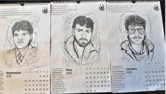 In fact, the form of the calendar has been used by Kashmiri activists and artists as an important political form in creating a narrative of Kashmiri dissent. Beginning in 2016, Association of the Parents of the Disappeared Persons (APDP), an organization that has played a momentous role in the human rights movement in Kashmir, has produced a calendar of the disappeared. Here, every month has been identified by a “disappeared” and his story. A rough sketch follows the narrative. The calendar, then, itself becomes a testament to the ever-present spectre of state violence in Kashmir. Every day of the month – for all 30 days – the viewer is almost made to stare at a face who does not exist in the world anymore. No one knows whether he will come back. If he will ever come back. No one even knows what happened to him.