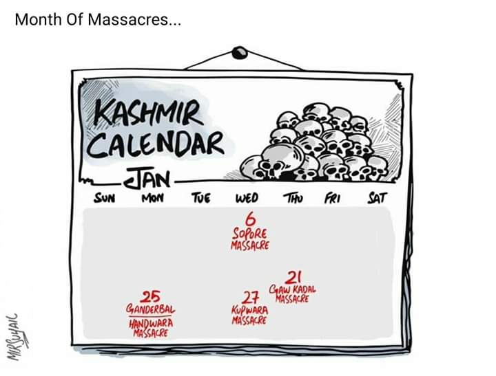 The month of January, in Kashmir’s history, has a complicated association with death. In fact, when seen from the vantage point of a Kashmiri sense of time, January can well be described as a “Month of Massacres”, marked as it is by four such events. And, this is how the month is often remembered and represented by Kashmiri artists. In a recent painting, entitled “Month of Massacres”, Kashmiri artist, Mir SuhailQadri, again takes up the form of the calendar. Done overwhelmingly in black and white, with a visual of skulls adorning the month of January on the right-hand top, only four days on the calendar have been marked – 6, 21, 25 and 27th. Painted in red, each of these dates signifies a massacre – Sopore, GawKadal, Ganderbal-Handwars and Kupwara. The rest of the calendar remains ominously empty, marked by a white that overwhelms. On the top left hand side, are two words written in bold and black letters – “Kashmiri Calendar.” And, not just a mere calendar. The insertion of the word “Kashmiri” embodies a need to characterize time in Kashmir as something specific and different. And, that difference is constituted by death. So much so, the other twenty-seven days in January – which are not marked by massacres – almost cease to matter. Death is a form of emptiness. A profound conclusion. But, such is the intensity of the spectre of death in Kashmiri social life, that its absence makes time itself empty.