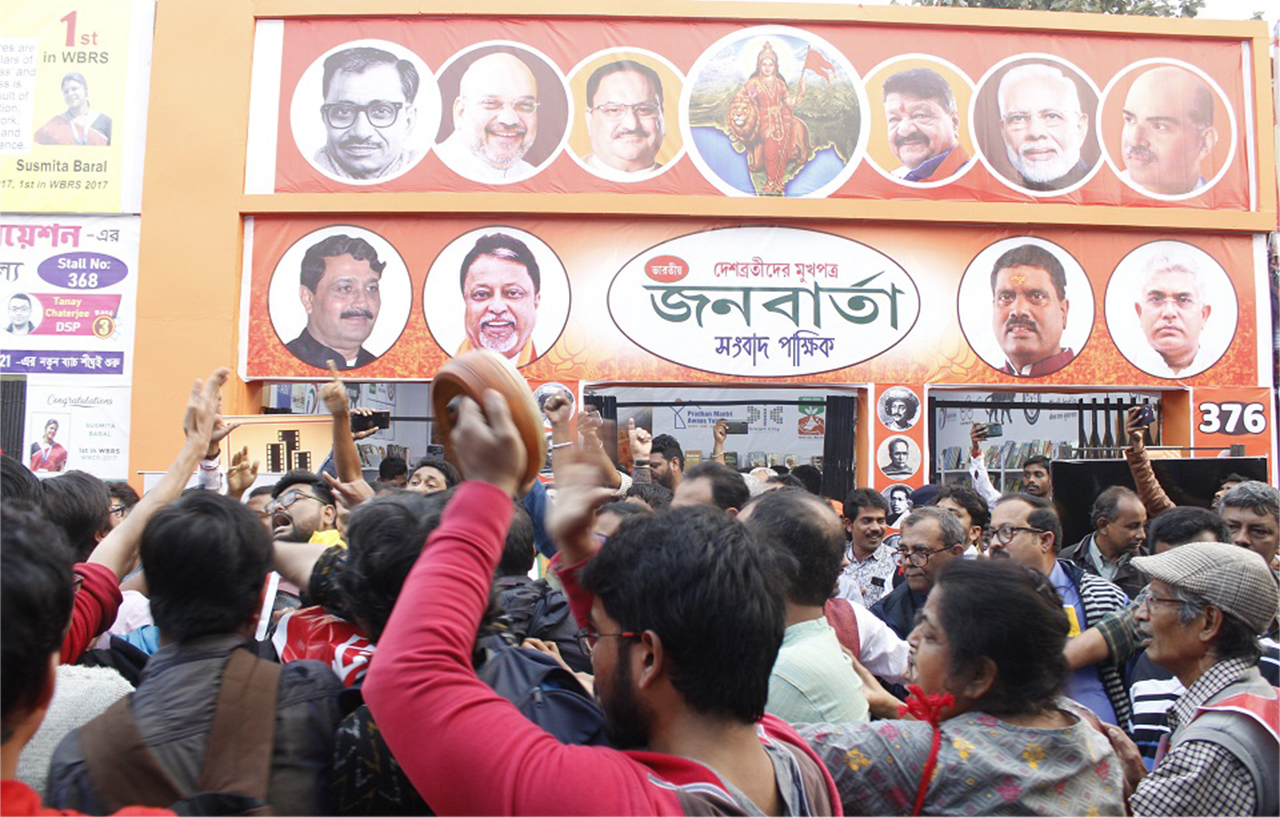 Earlier in the day, the supporters of the BJP attacked a group of peaceful protesters staging a silent demonstration in front of the stall of “Janabarta”, the party’s West Bengal mouthpiece. In particular, they were protesting the visit of the BJP MLA, Rahul Sinha. The police, despite being present, let the attack to happen and then detained two of the protesters at the police control room inside the book fair.