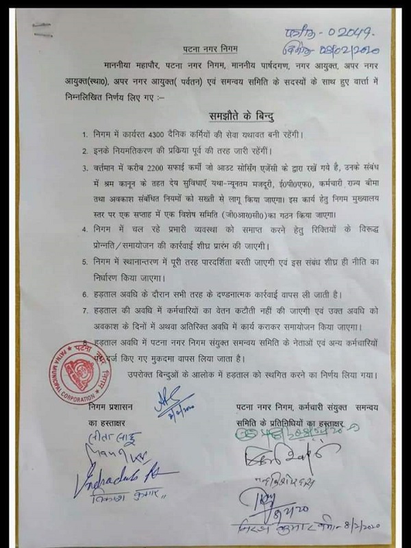 State capital residents heaved a sigh of relief as the strike by daily wage workers of the Patna Municipal Corporation (PMC) postponed their strike for two weeks. It had been six days since the strike began. The strike was postponed following talks between the PMC workers’ union leaders, the mayor of the city, councillors, and government officials.