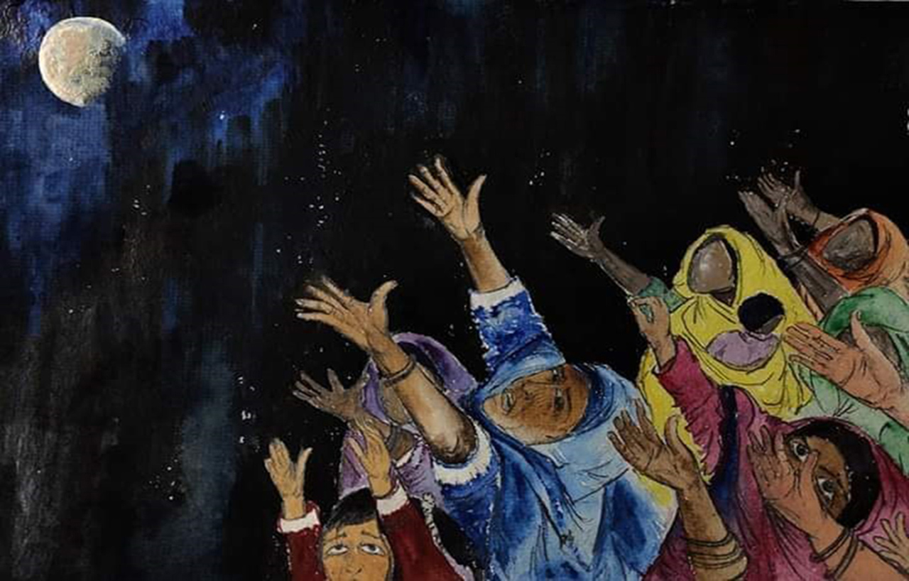 ‘ওরা হিংসাভূমি নির্মাণের প্রথম পদক্ষেপে আমাদের সরল বিশ্বাসগুলো ধংস করে তারপর সেই শূন্যস্থানে ওরা দিলের ভুখ মেটাতে অন্ধবিশ্বাসের রোপণ করে।’ গগনে চাঁদ ওঠার কালে মহালগনের অন্ধকার আঁকলেন লাবনী জঙ্গী।