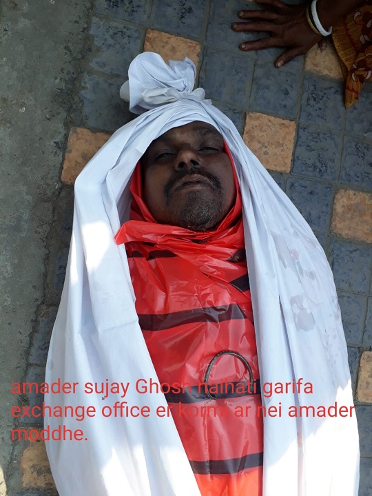 লকডাউন ঘোষণা হওয়ার পর মাত্র কয়েক ঘন্টা। গত ১২/১৩ মাস বকেয়া মাইনের একটি টাকাও পাননি। এই অনিশ্চিত সময়ে পরিবারকে বাঁচিয়ে রাখবেন কীভাবে? আতঙ্কের সঙ্গে যুঝতে পারলেন না  বিএসএনএল-এর চুক্তি শ্রমিক বছর চুয়াল্লিশের সুজয় ঘোষ। বিষ খেয়ে আত্মহত্যা করেছেন। সুদর্শনা চক্রবর্তীর  রিপোর্ট।
