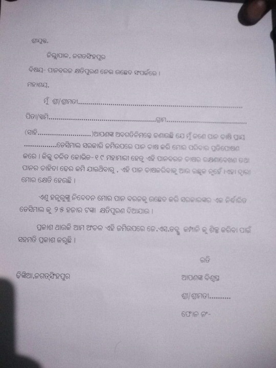 Despite the Covid-19 pandemic and super cyclone Amphan, the district administration of Jagatsingpur in Odisha, is busy hatching new conspiracies to usurp the land of the people of Dhinkia Charidesh. Recently, forms has been circulated in the villages of the three Panchayats of Dhinkia, Nuaagaa and Gada Kujang by the administration, where the people have to sign on a statement, giving their names and addresses along with the area of land under betel leaf cultivation.