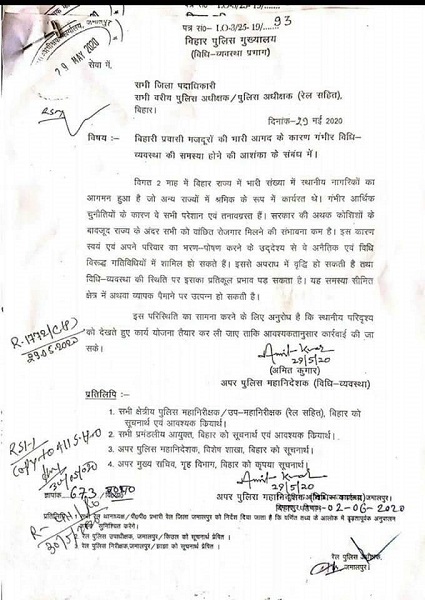 The Bihar government’s attitude towards migrant workers can be gleaned from a controversial letter from the police headquarters. The letter indicated that the massive influx of migrant workers may cause law and order problems. The letter was issued on 29th May by ADG (Law and order) Amit Kumar to all SPs, in which it said