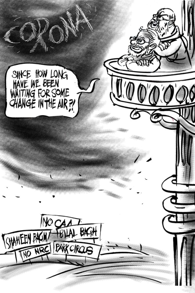 From the point of view of social justice movements, the coronavirus pandemic could not have come at a worse time. From the point of view of our fascist government, it was a blessing: it handed them a get-out-of-jail-free card, a free pass to dismantle the anti-CAA-NRC-NPR agitations that had been building up for months and represented an extraordinary civil society response to discriminatory and unconstitutional laws. Sarbajit Sen’s cartoon captures the mood of Amit Shah and PM Modi as the coronavirus was approaching: