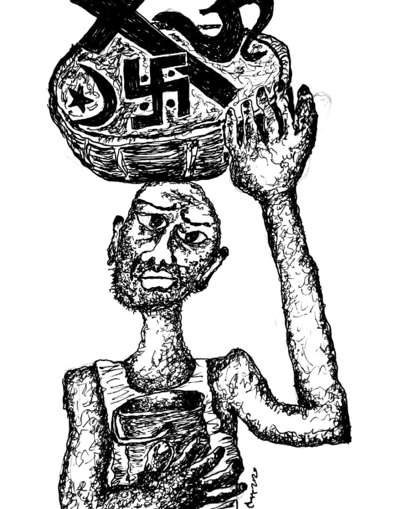 Sunil Abhiman Awachar’s drawing of a worker carrying various religious symbols on his head makes clear that irrespective of the sense of security the BJP wants to provide to the Hindu working class in India, a time will come when they are honest about how they see the working classes: as a nuisance. On that day, nobody will be spared, as the Draconian lockdown being a small hint.