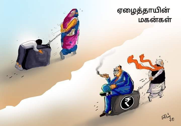 Returning to the question of the government’s corporate affinity, one of the first actions to draw the ire of cartoonists was the Rs. 68,000 crore corporate loan waived by the government. This was the same government that mishandled the food and transportation arrangements for millions of migrant workers and argued with the state governments about who would foot the bill for these essentials. These were the same corporates who were finally let free if they didn’t pay their workers for the lockdown period. An unknown artist’s drawing that became a popular WhatsApp forward brought the point home. It was based on yet another woman and her child who became the face of the migrant workers’ plight during this phase.