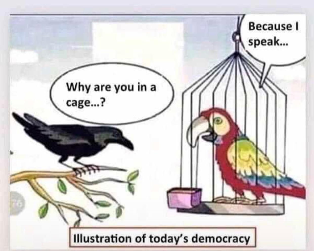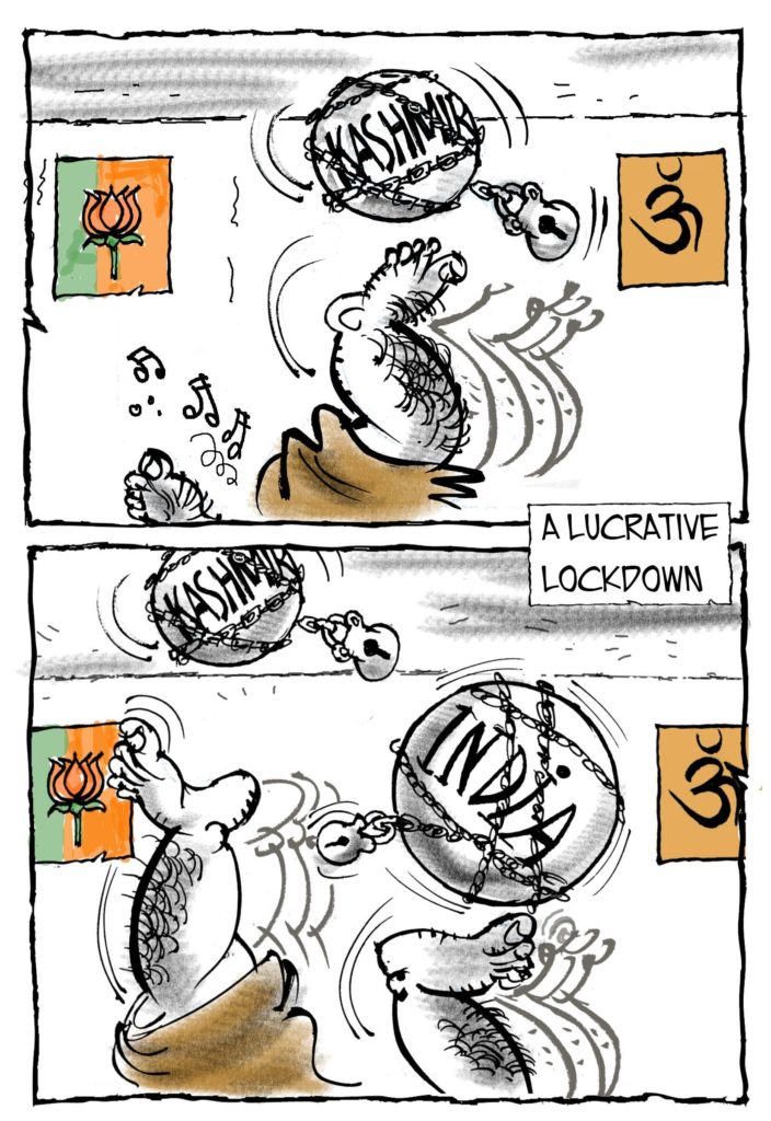 The protests, led by scores of courageous Muslim women all over the country, caused such alarm to the Hindu supremacist government that it had to stage a full-fledged riot (which claimed the lives of over fifty people) to vilify the protesters. The state of Indian democracy was depicted in another cartoon that became popular during lockdown, as the government kept picking up CAA protesters and filing false chargesheets against them.