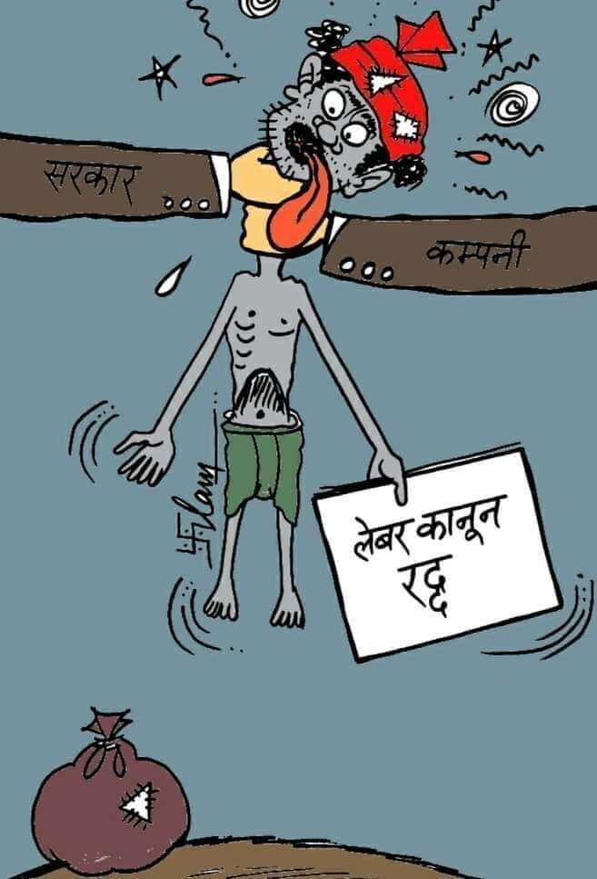 As mentioned in the above cartoon, the hand-in-hand role of the companies and the government became clear when the labour law reforms were pushed through during the lockdown phase. Vijay Ravikumar’s cartoon for Worker’s Unity shows the scary prospect of workers from Uttar Pradesh returning home only to be faced with 12-hours working days and other dilutions of labour laws that have been fought hard for. (Although the law has now been repealed in UP by an HC order, it remains in several other states.)