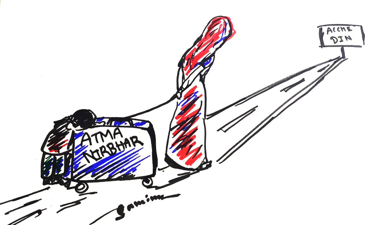 Horrific scenes from the reverse migration of labour would no longer be an aberration – rather, it would become the norm. The Atmanirbhar India would normalize the mother dragging her sleeping child on a suitcase. Samim Akter Sheikh draws –