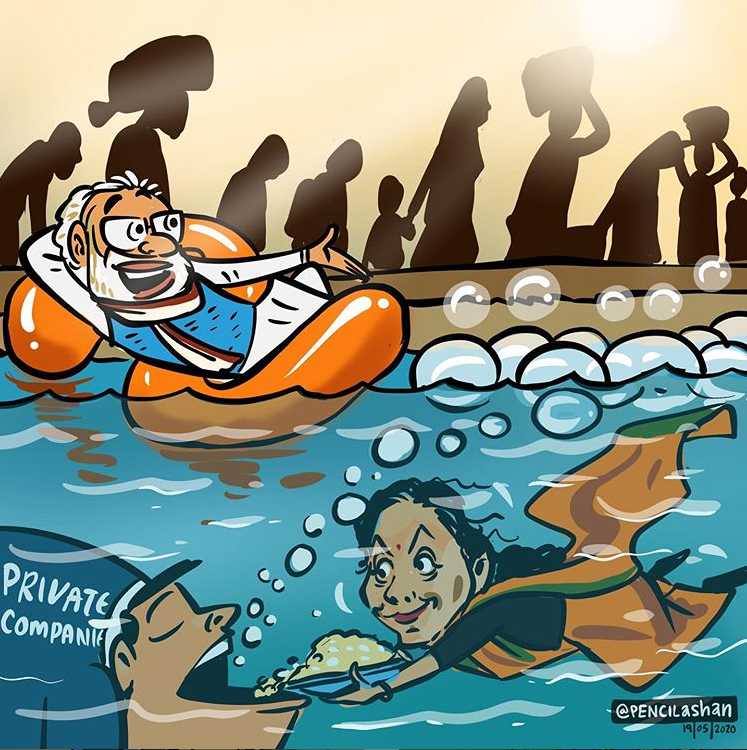 The government’s most hilarious and most dangerous pro-corporate anti-worker joke was the Atmanirbhar speech. While it was a prize catch for cartoonist and meme makers, it spoke of a long term plan – total privatization and contractualization. Rebel Politik addresses it in his cartoon.