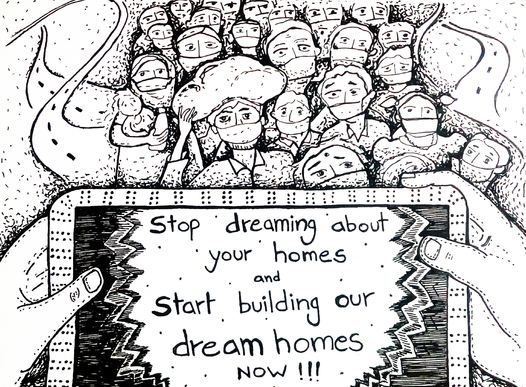 Due to lack of means of livelihood at their home states, many workers are now being forced to go back to the workplaces they quit and walked away from in order to get back home, often having to walk hundreds of kilometers or pay a fortune to take a bus. Sarbajit Sen’s drawing shows a dystopian world where the chained workers are walking towards a Mordor-like representation of industry, with many dying on the way.