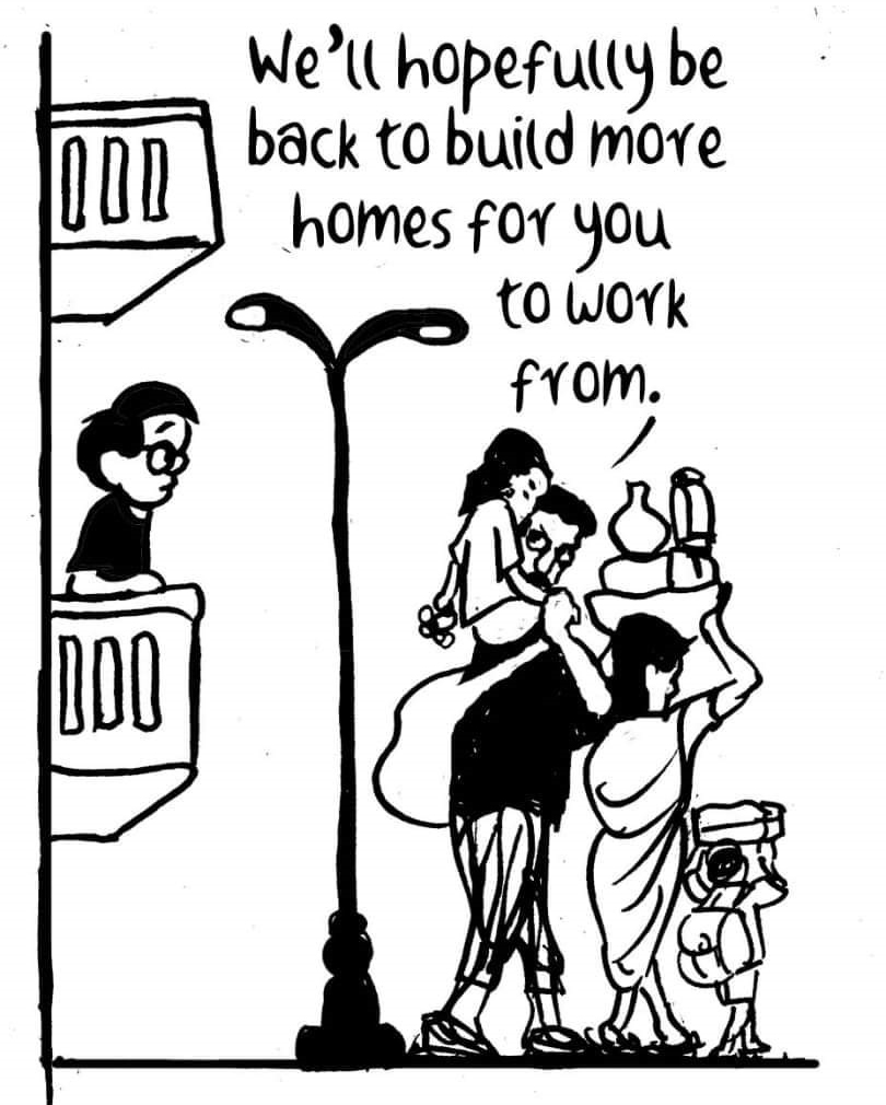 To be fair though, we must acknowledge that except for the hard communal line, the rest of the awful governance on display by the BJP is a hand-me-down from the now-opposition Indian National Congress – especially the proclivity to maintain close ties to corporate houses. The BJP is not even hiding it any more. During the lockdown, one of the reasons the government kept acting so clueless was that all the decisions around the migrant worker issue were taken based on the reaction from corporate houses and industry/builder lobbies, as Vasvi Oza’s drawing shows: