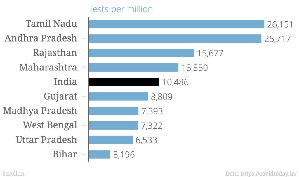 The lack of testing and tracing of contacts seems to be in part dictated by political compulsions. The state is scheduled to go to polls later this year and Nitish Kumar is underplaying the situation for as long as he can. Aggressive testing will result in more positive cases being detected and will put more burden on the already crumbling heath infrastructure.