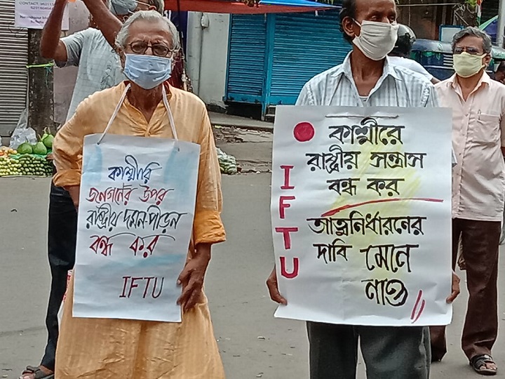 In view of the fact that 5th August, 2020 marks the completion of one full year of the siege in Kashmir, following the abrogation of Article 370 in Kashmir, a protest meeting was convened at Jadavpur 8B bus stand in Kolkata by mass organizations such as AISA, Pratisaran, Bandi Mukti Commmittee, Feminists in Resistance, CRPP, AIPWA, IFTU, PYL, WSS, RSF, PDSF, Nari Chetana, Ahalya, Jadavpur Commune, FOD and PUCL. Because, 5th August, 2020 also marks the inauguration of the Ram Mandir at Ayodhya, which, as many have commented, also marks the formal inauguration of the Hindu Rashtra in India, the meeting, also turned into a protest against the said event.