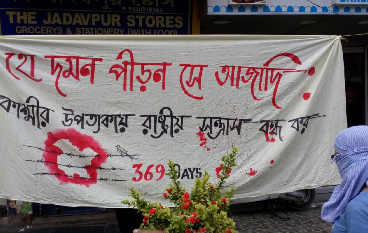 Speakers, who consisted mostly of the activists in the student, youth and women’s movement in Bengal, spoke about the histories of the intense violation of human rights in Kashmir, the history of the Indian state’s broken promises in the Valley, and how, even in the history of Kashmir, the last one year has been one of unprecedented violation of human rights and an indefinite seizure of the Kashmiri rights to free expression of voice, opinions and dissent. Many also spoke about the importance for us to remember that the lockdown, severe as it has been in Bengal and other parts in mainland India, is not to be compared to the lockdown in Kashmir. The lockdown in Kashmir also comes with the spectres and realities of a militarized occupation, which, has not only stalled the possibility of any “normal” life in Kashmir, but with the yearlong absence of 4G internet, has made it almost impossible to avail oneself of the resources and infra-structural changes that the pandemic-induced lockdown necessarily demands.